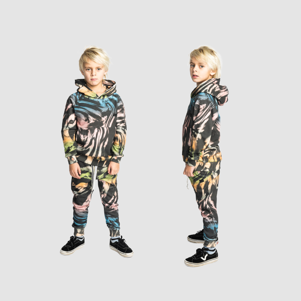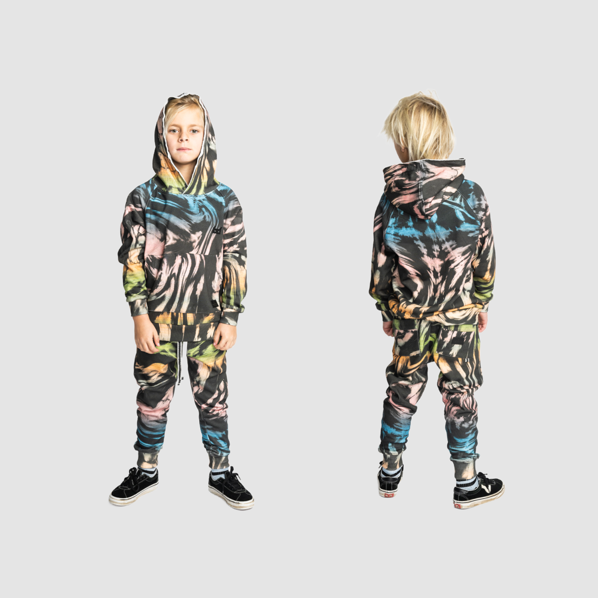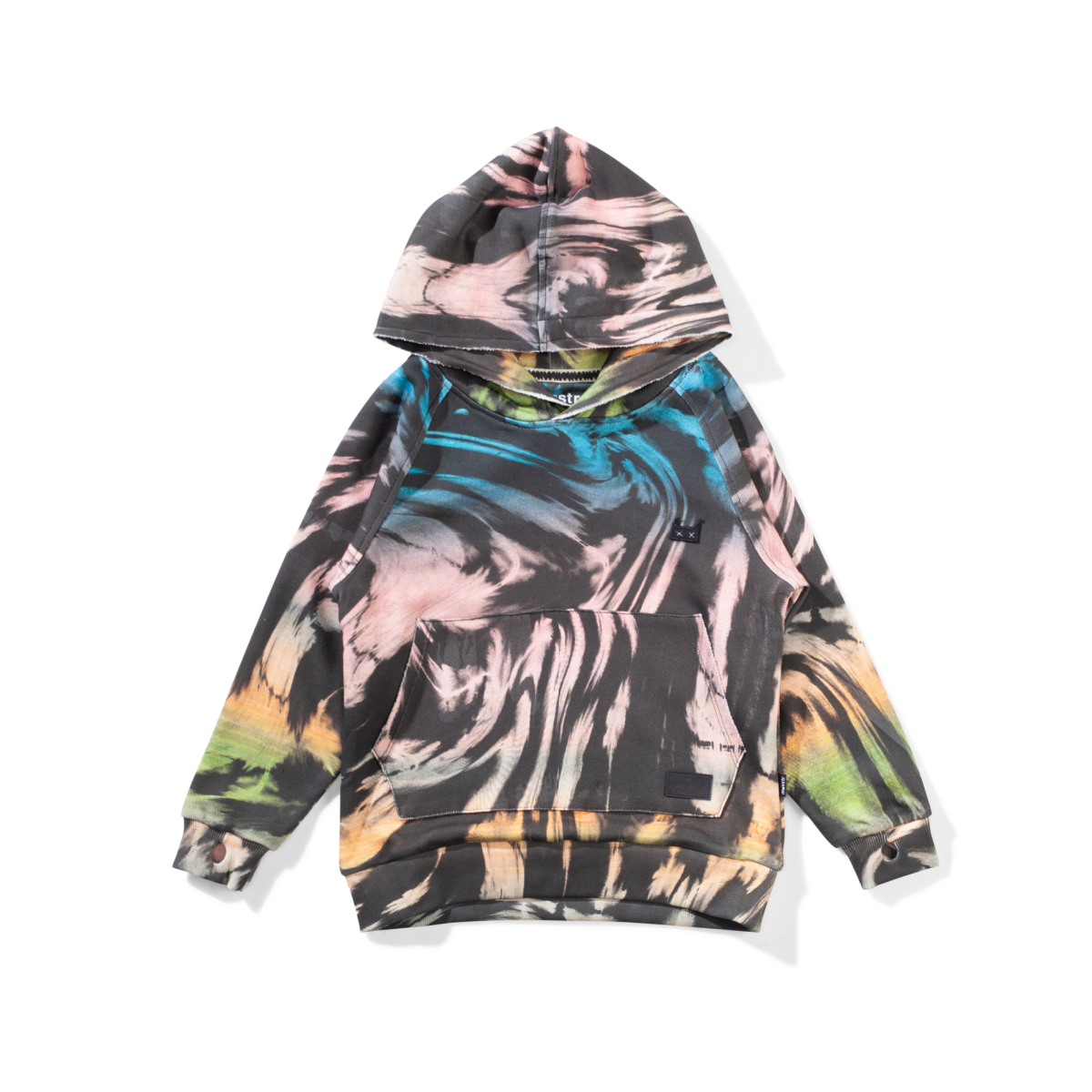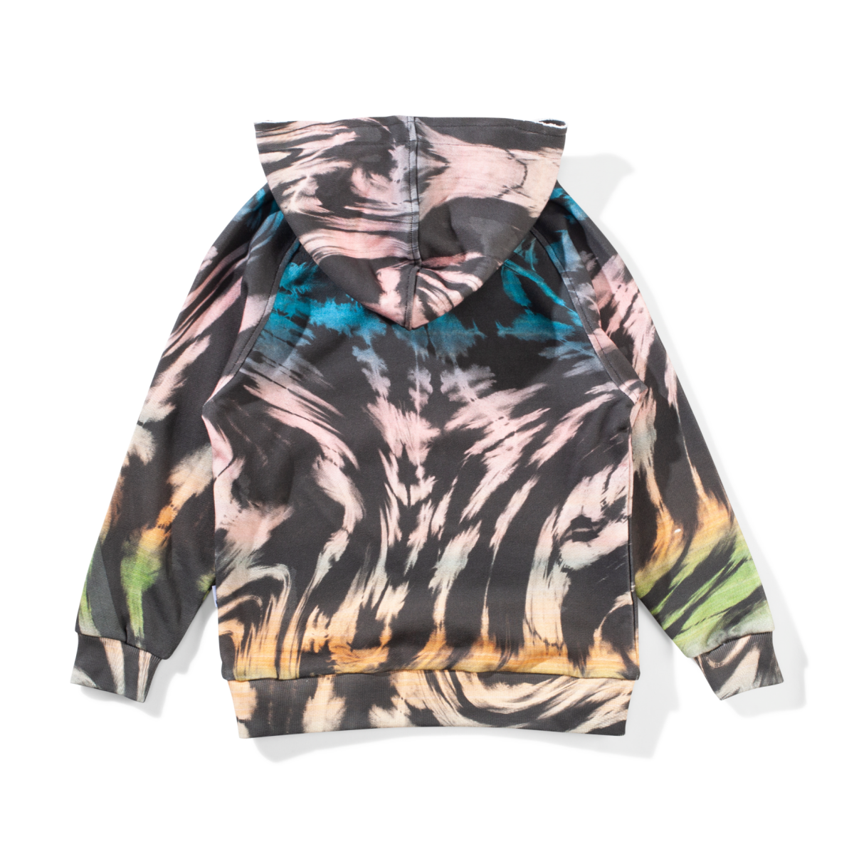 A rad hooded sweatshirt featuring an all over colorful digitally printed swirl design with a relaxed fit and kangaroo pocket.