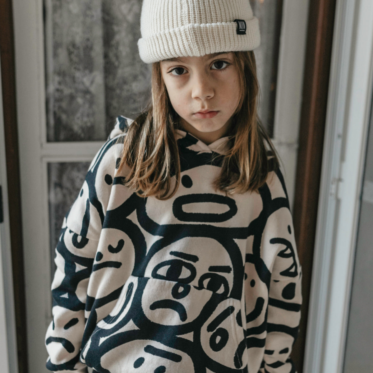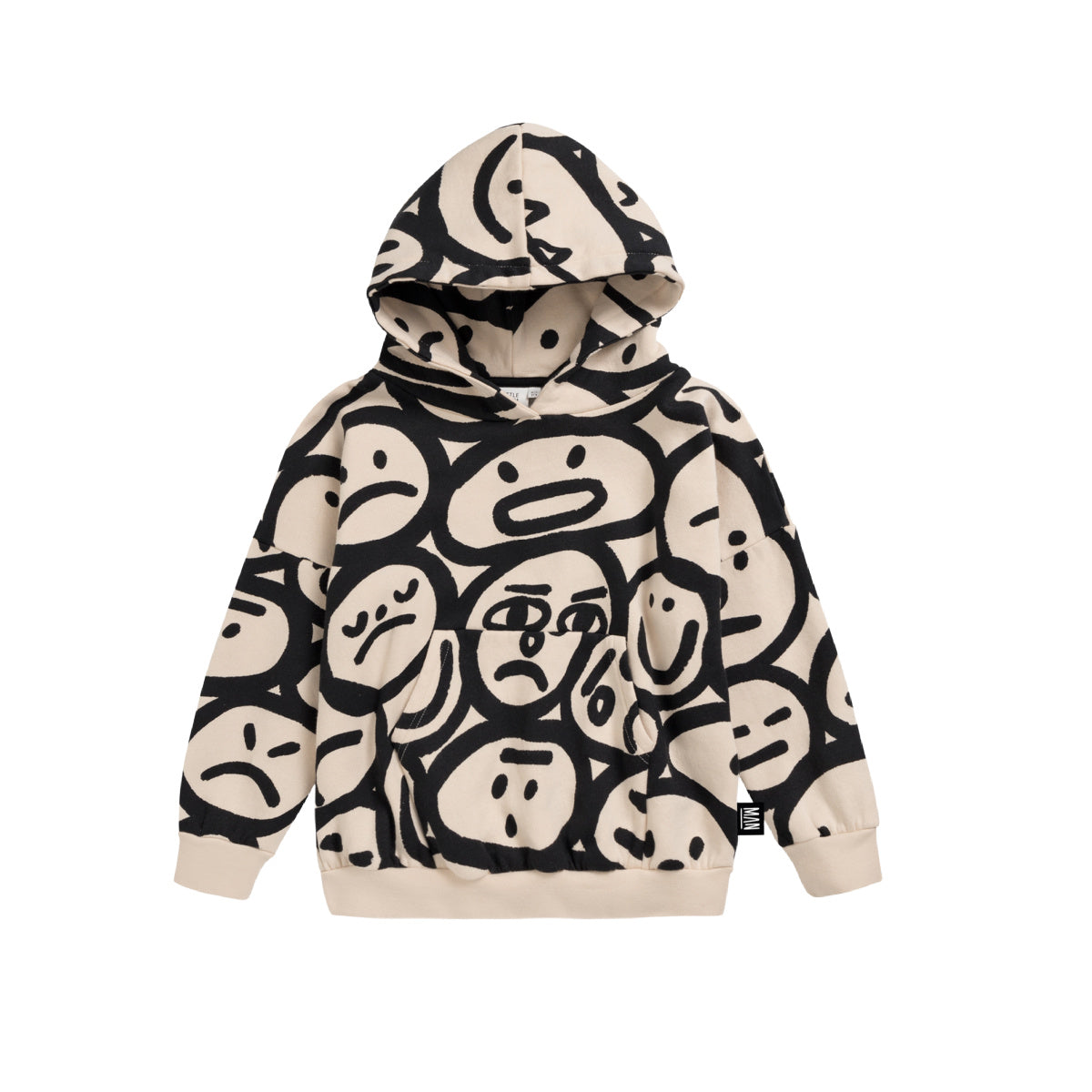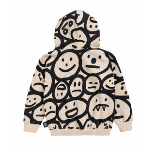 A rad and boxy loose fitting hooded sweatshirt with an all over silly faces print on an off white base in brushed fleece cotton. Features a rounded neckline, a dropped shoulder and kangaroo pocket. Designed for boys and girls.