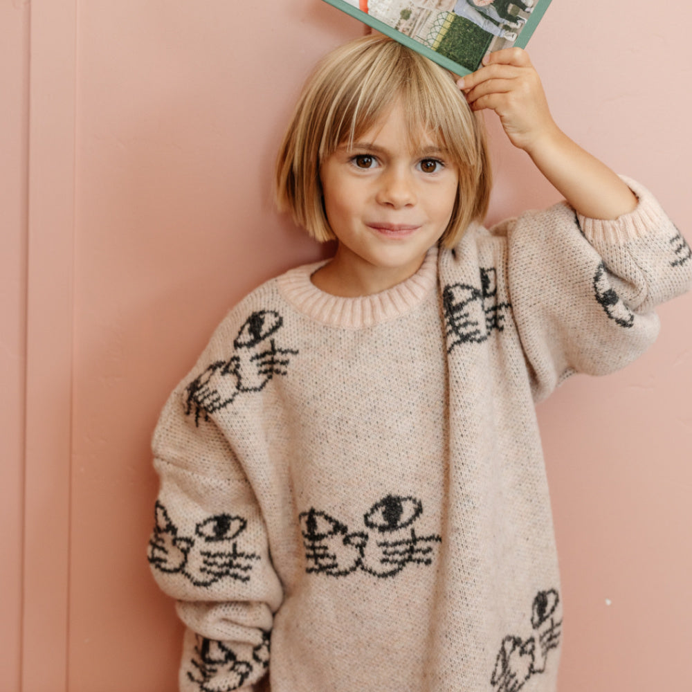 A chic and unique knit pink sweater featuring a black smiling cat print with a relaxed fit. Rock it as a sweater dress for the most adorable fit! Designed for boys and girls alike.
