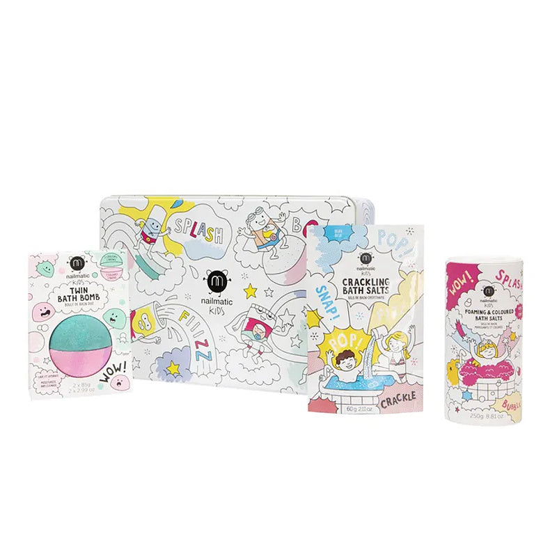 The Splash Bath Box for kids is a delightful bath time experience that transforms routine bath time into a moment of joy and relaxation. This curated bath box includes three super fun products: duo bath bomb, blue foaming & colored bath fizzing salts (turns your bath water blue!), and pink crackling salts. Bonus, it's packaged a great reusable tin box!