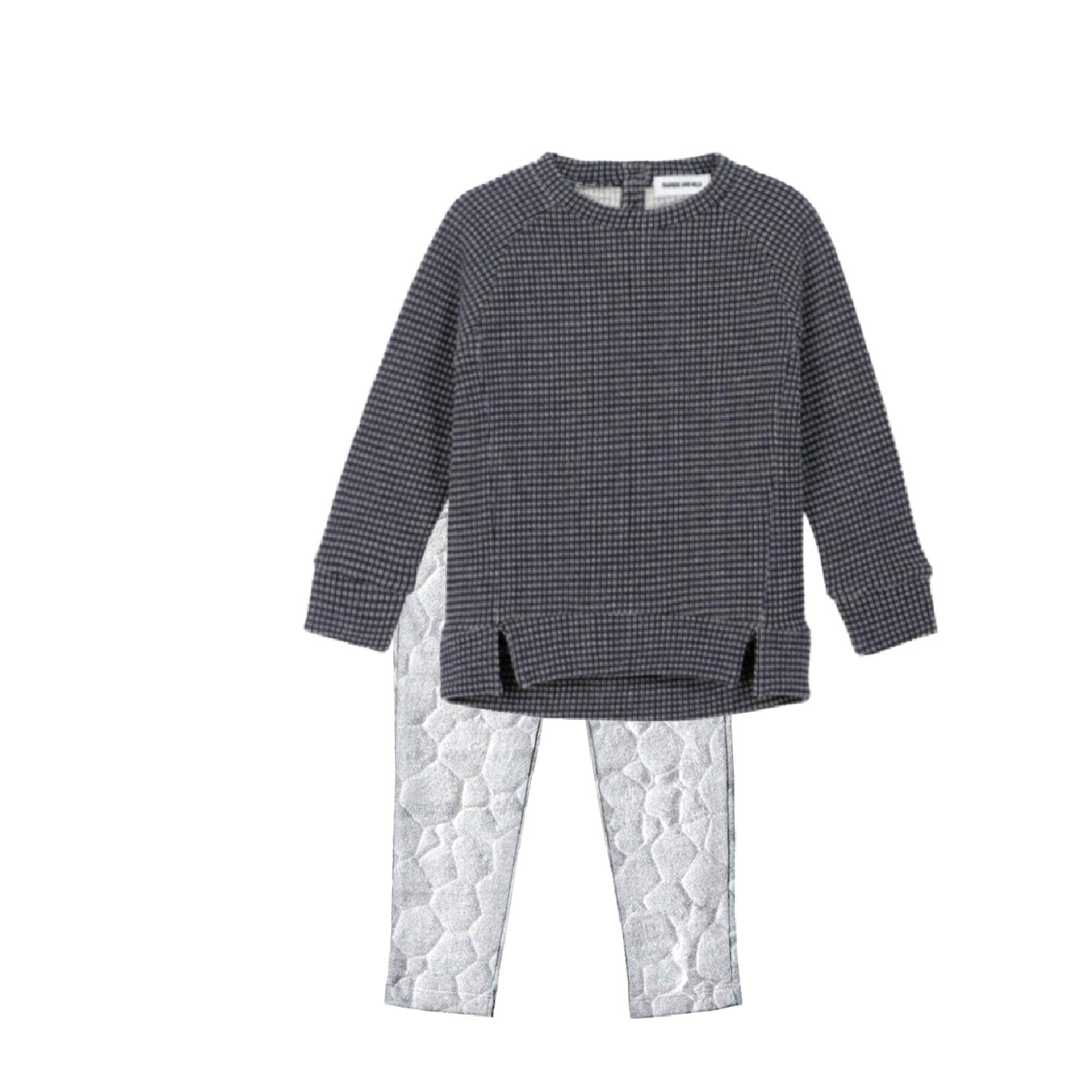 A beautiful structured top featuring an all over black and white design with a slim, true to size fit and a unique grey legging with a textured print!