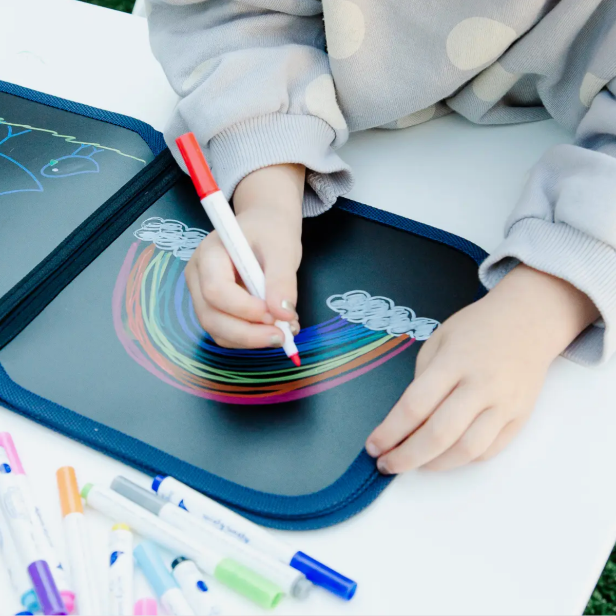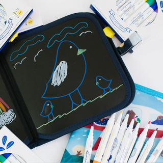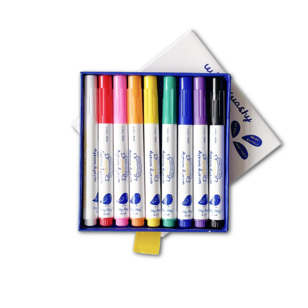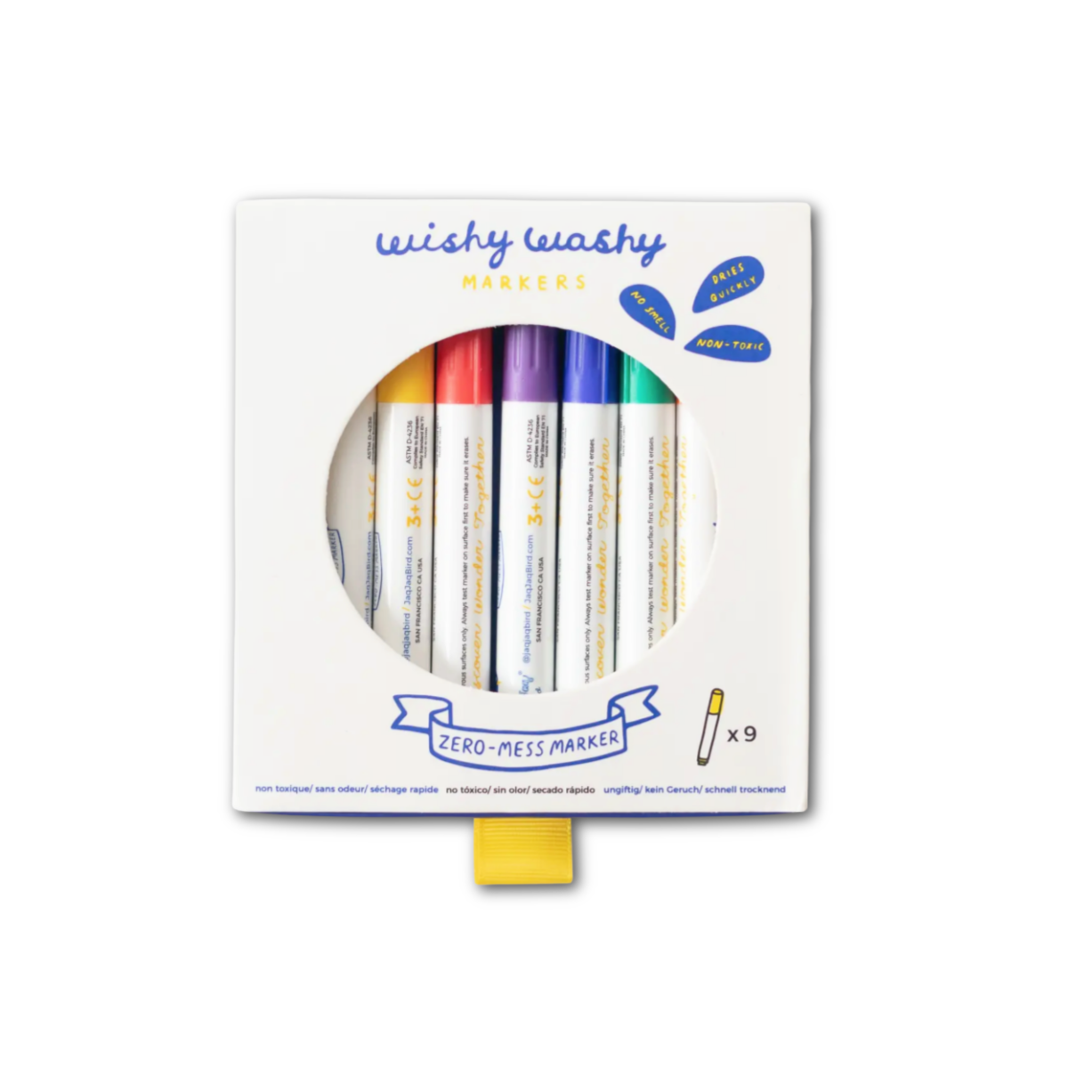 Creative kids shouldn't have to be decisive! Wishy Washy Markers are non-toxic and safe for children. Wishy Washy Markers can be applied and erased on all Jaq Jaq Bird products and most non-porous surfaces including walls, glass, cups and more. Simply wipe clean with a damp cloth to erase.