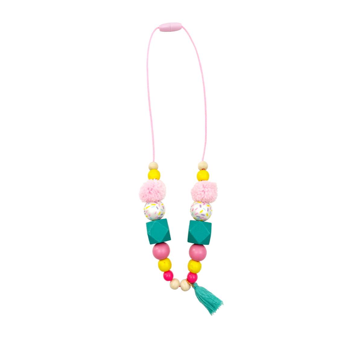 Celebrate birthday with sparkle and sprinkles. Each necklace is hand beaded in the USA with a mix of wood and/or acrylic beads, unique charms, and a matching tassel. Makes for a great accessory to celebrate their special day!