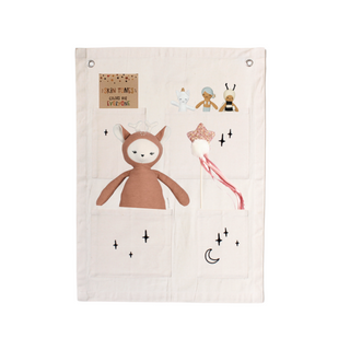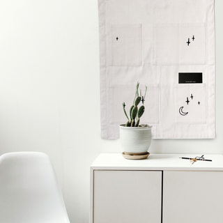 The Starry Night Wall Hanging features a unique moon and star print on the front with four (4) pockets and an exclusive DLK x Imani Collective label. All printed on a beautiful natural canvas (off white), hand printed and sewn by local artisans in Kenya.