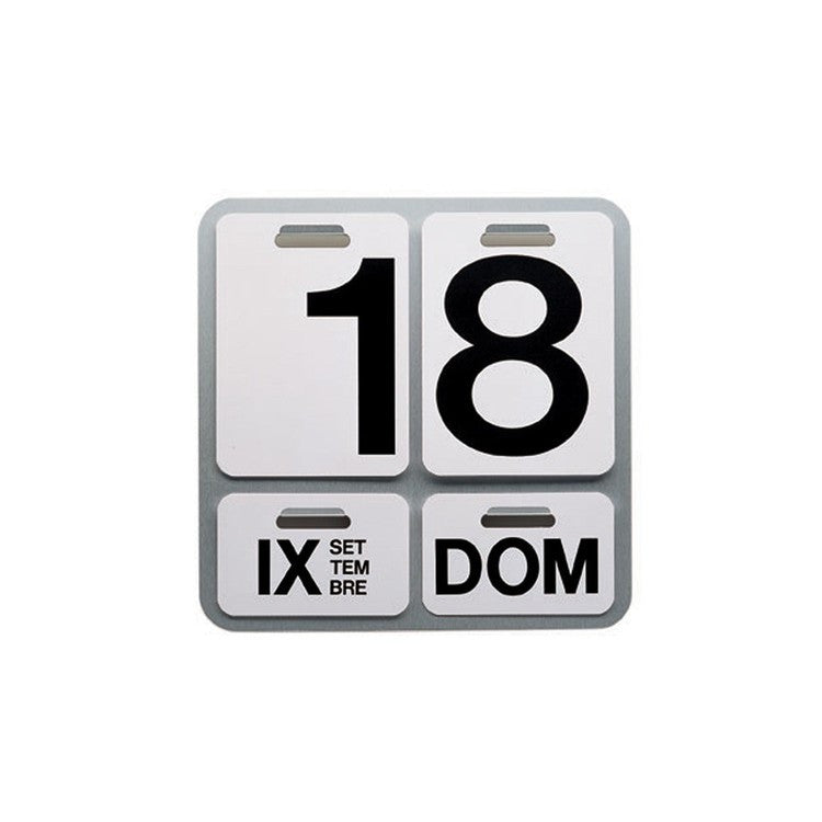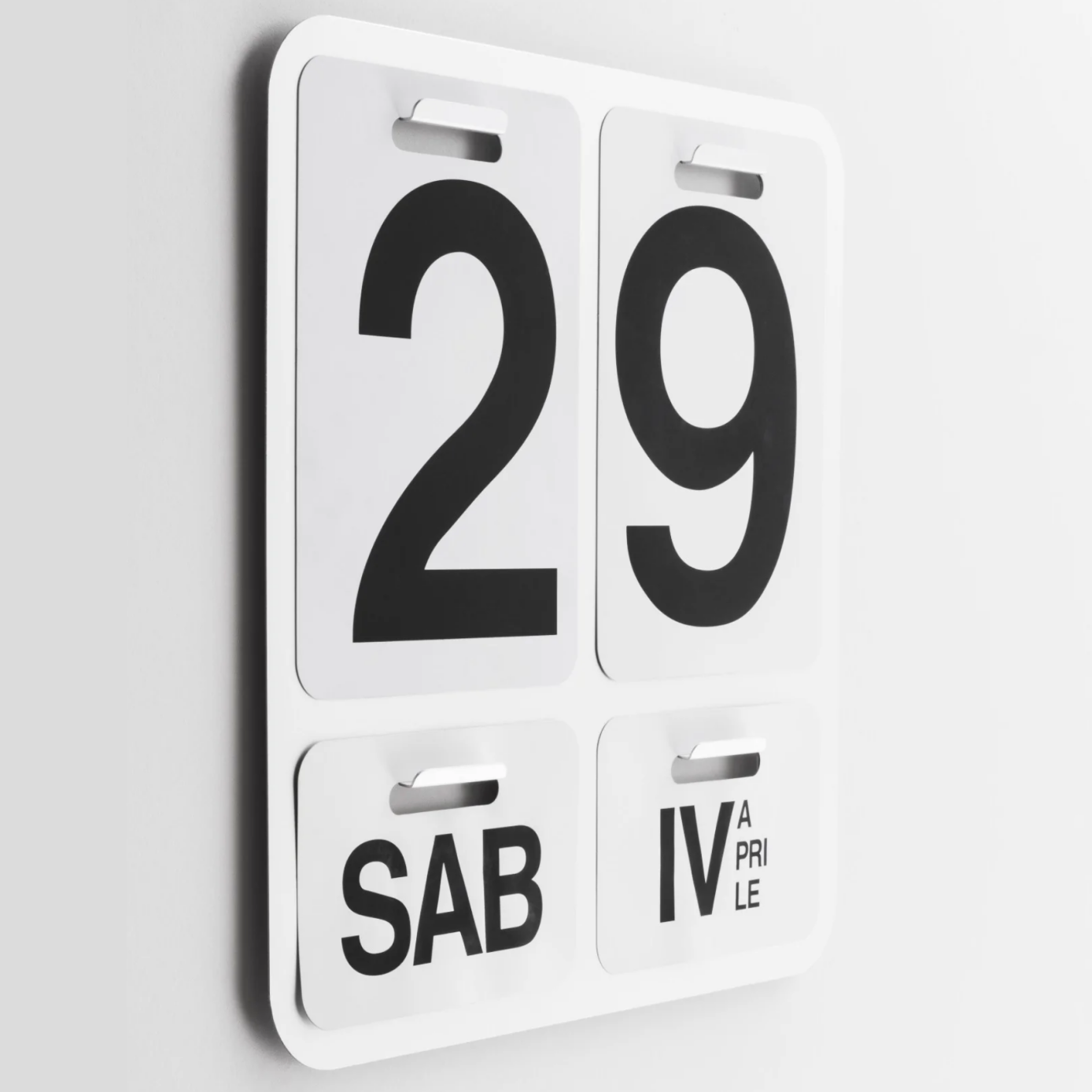 Originally designed in 1959 by Enzo Mari, this minimalist rendering features a perpetual design that can be used year after year. The calendar is divided into four distinct sections including two numerals for the date, one Roman numeral for the month and an abbreviation for the day of the week.