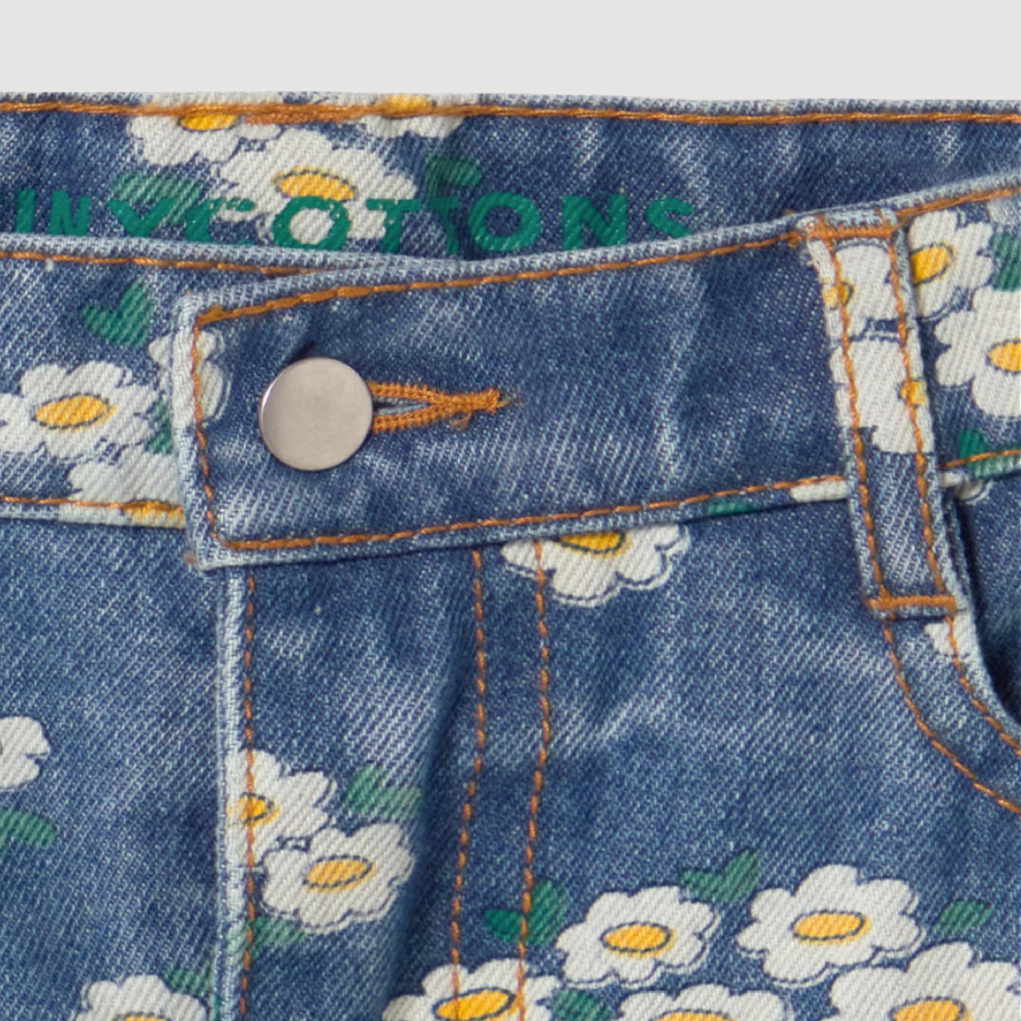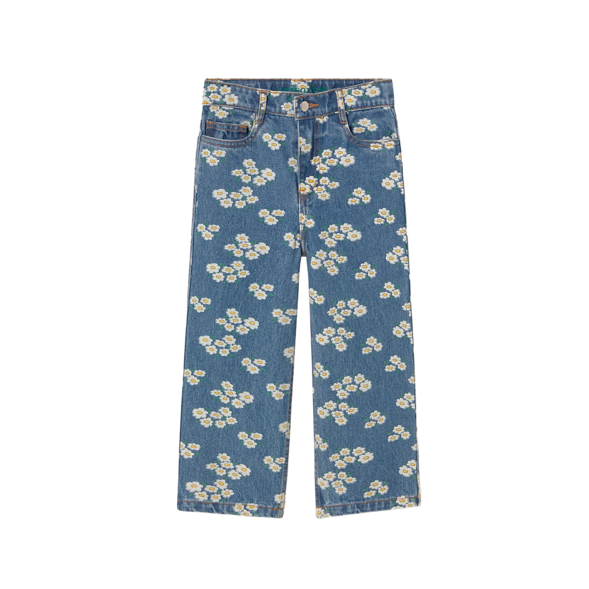 These classic-cut denim pants are made from durable 100% cotton fabric. Featuring a straight-leg silhouette, adjustable waistband, and snap button closure, they offer a comfortable and practical fit. Contrasting stitching adds a fresh, distinctive touch, while the Blossoms print on the lower front provides a delicate and charming detail.