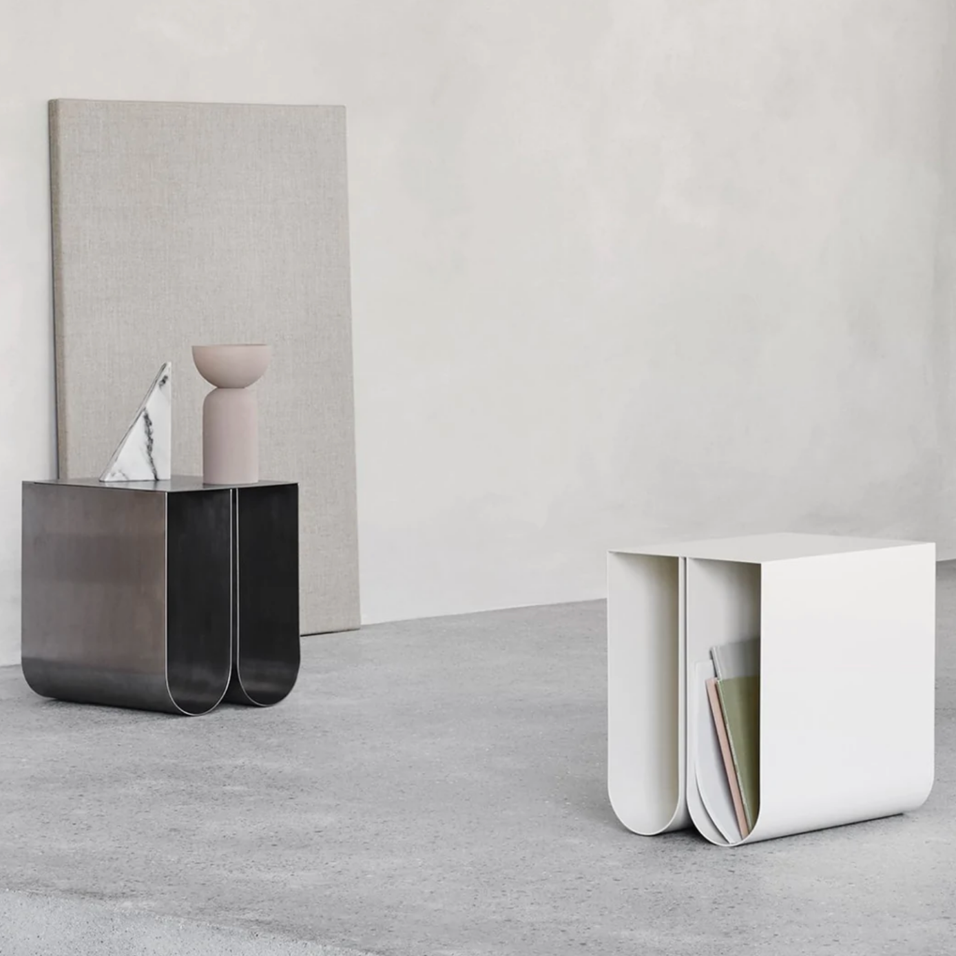 • The Curved Side Table is a beautiful and timeless small table that combines a sculptural and handcrafted aesthetic. Made of slick black powder coated steel this small side table is also able to store your magazines within its curved base.