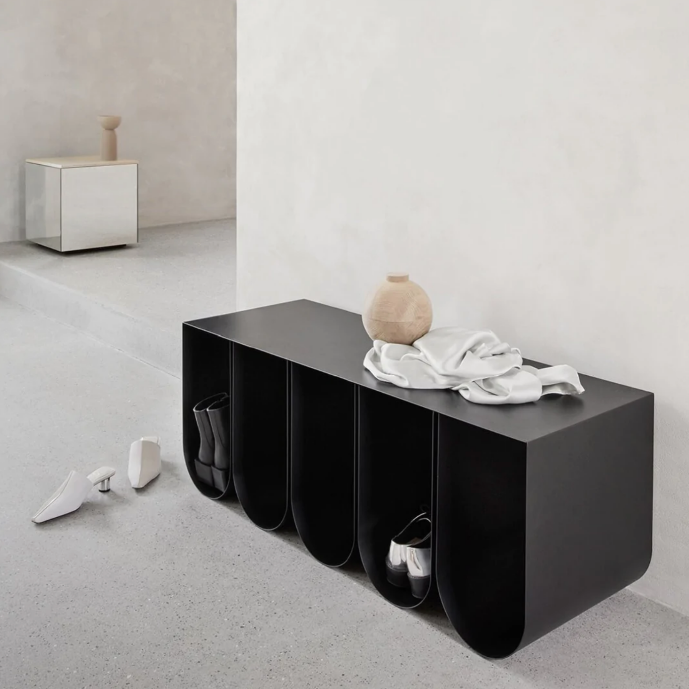 • Made of slick black powder-coated steel the Curved Bench makes a bold and graphic statement in any habitant.   The bench also enable you to store your magazines within its curved base. Simple, distinct and functional design - because the world is complex enough.