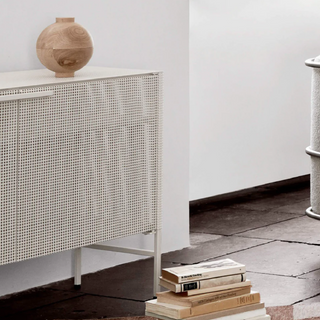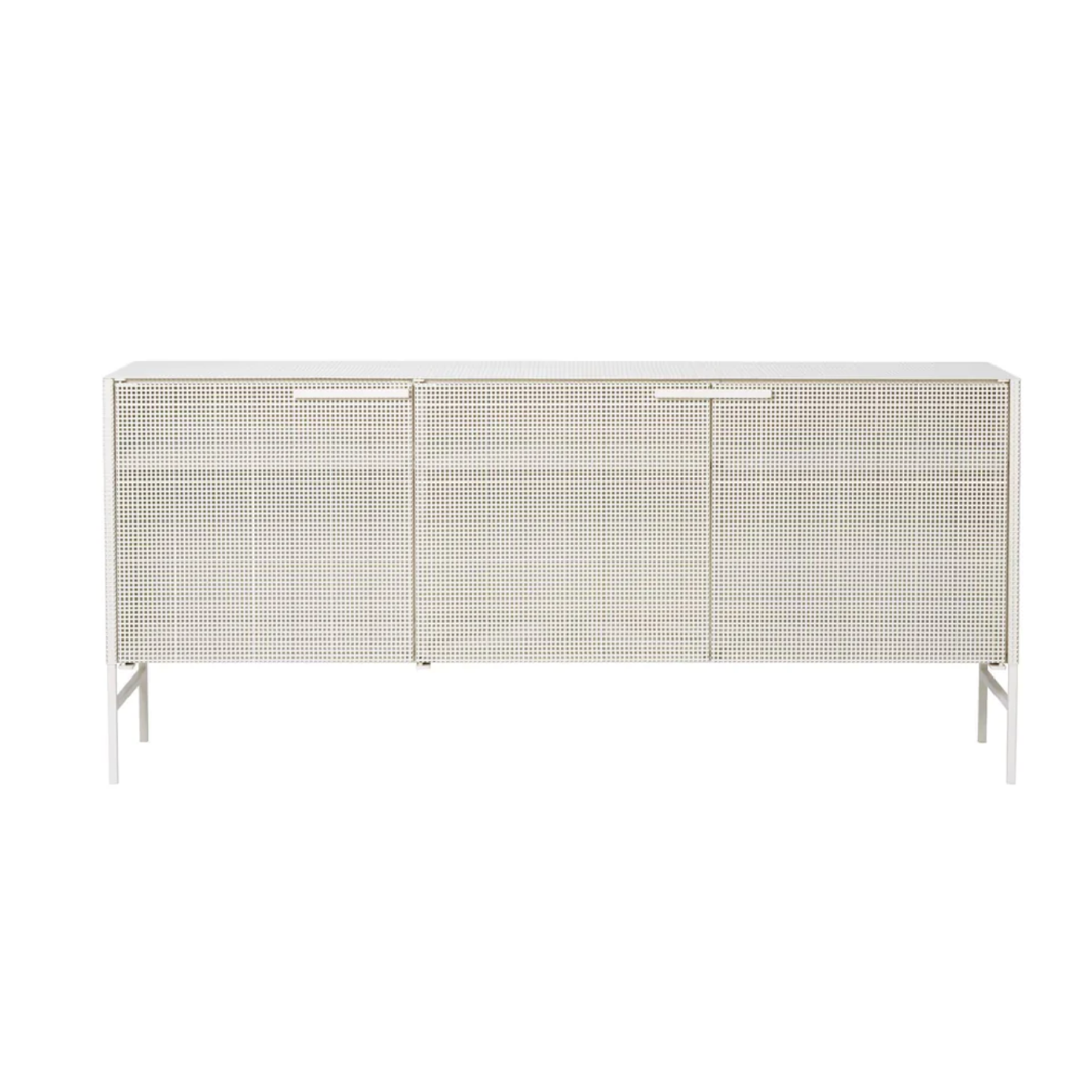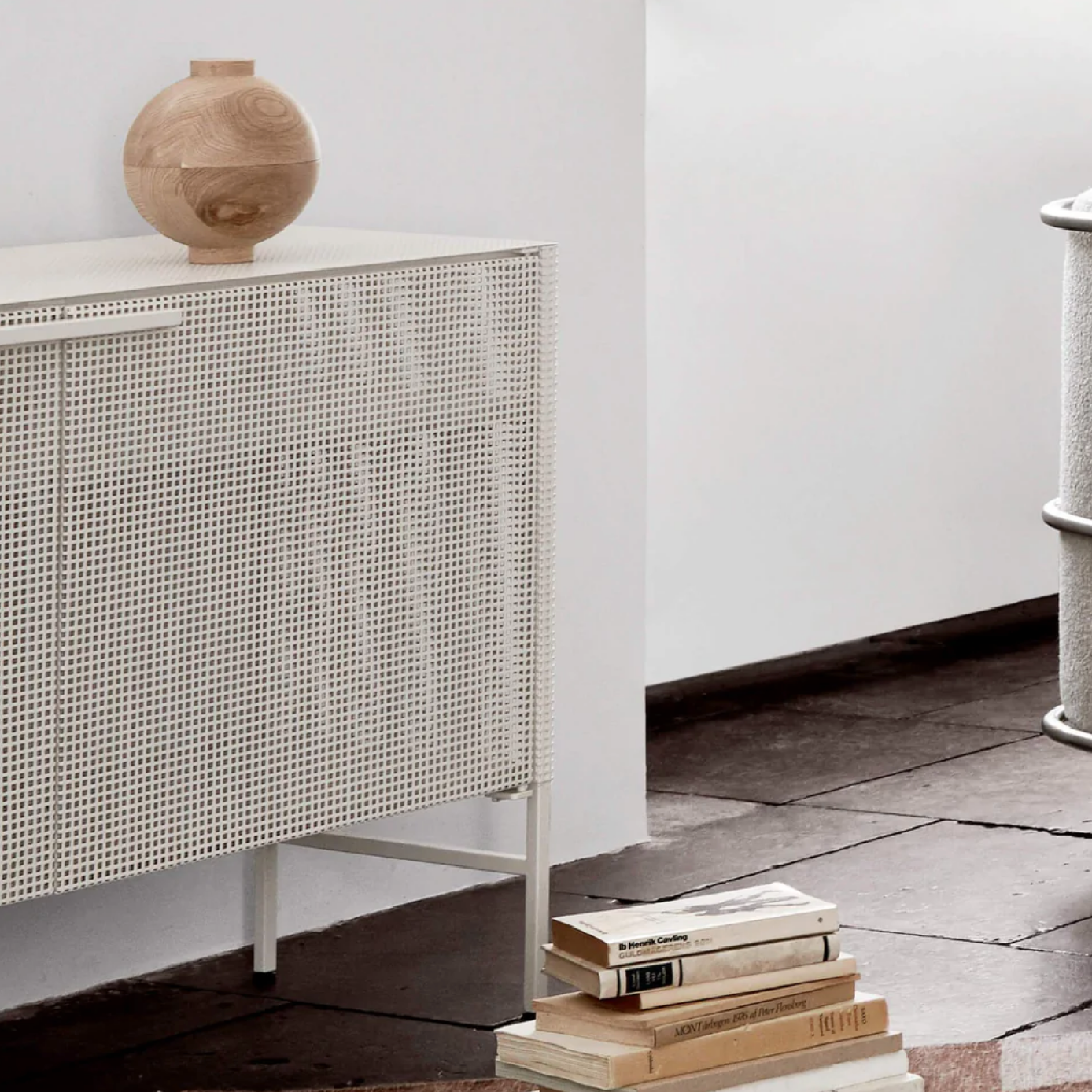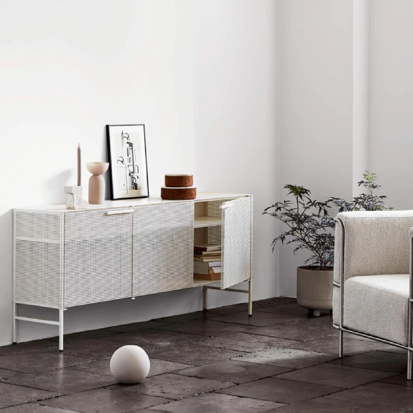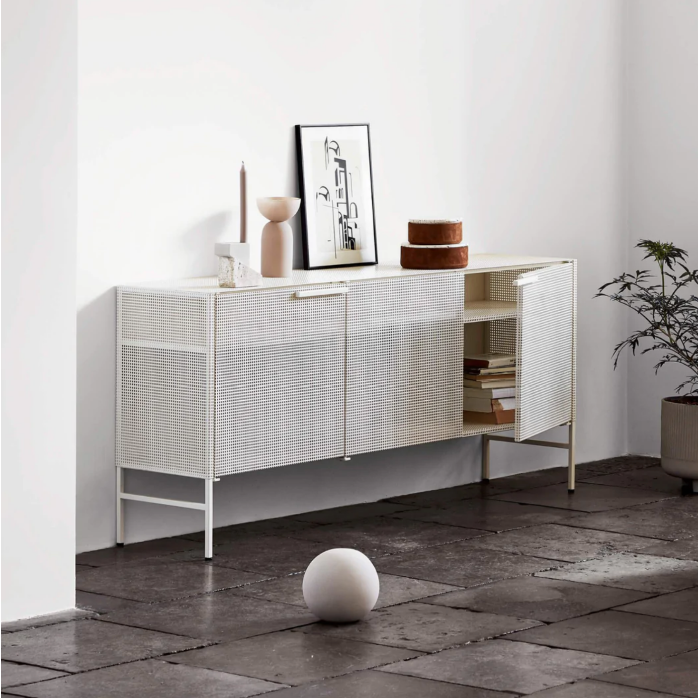 Minimalistic with crystal clear lines and a pellucid appearance. The grid sideboard comes with two fixed perforated steel shelves. The three sideboard doors opens outwards and closes with a magnetic lock. The top plate of the Grid Sideboard is made of perforated beige steel, just like the top plate is on our Grid Cabinet. Large cupboards like the Grid Sideboard has been popular for generations due to their ability to store and display any favourite accessories.