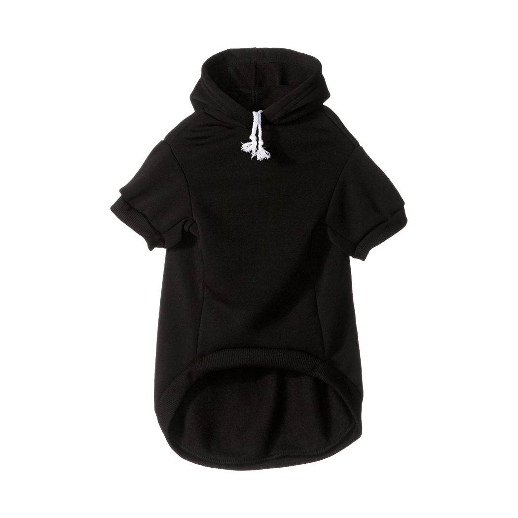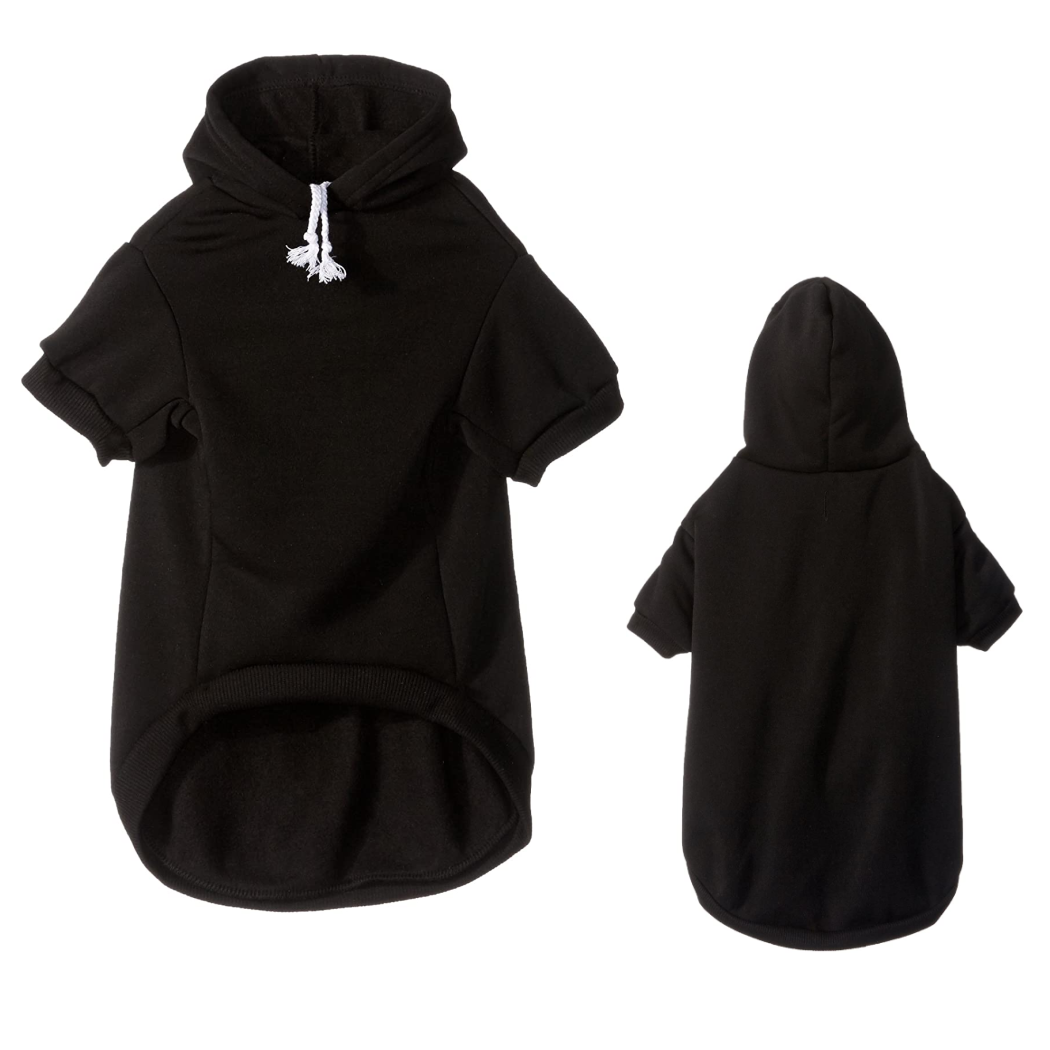 Finally modern dog finds that look good and feel even better. A simple black hoodie with a white drawstring and cuffed sleeves, because ... yes. Features a simple hole for easy access to their collar for those long walks on the beach that you like to take together.
