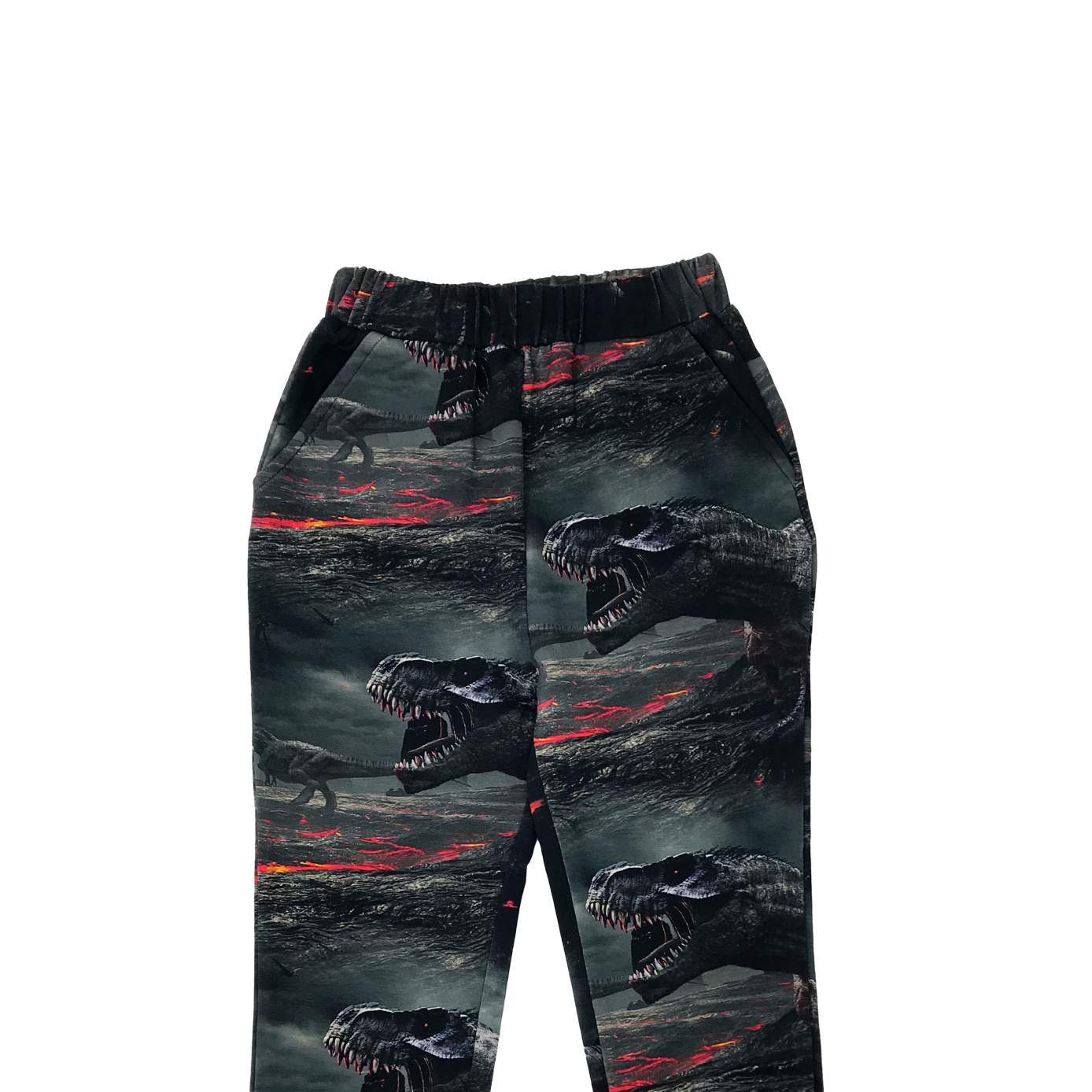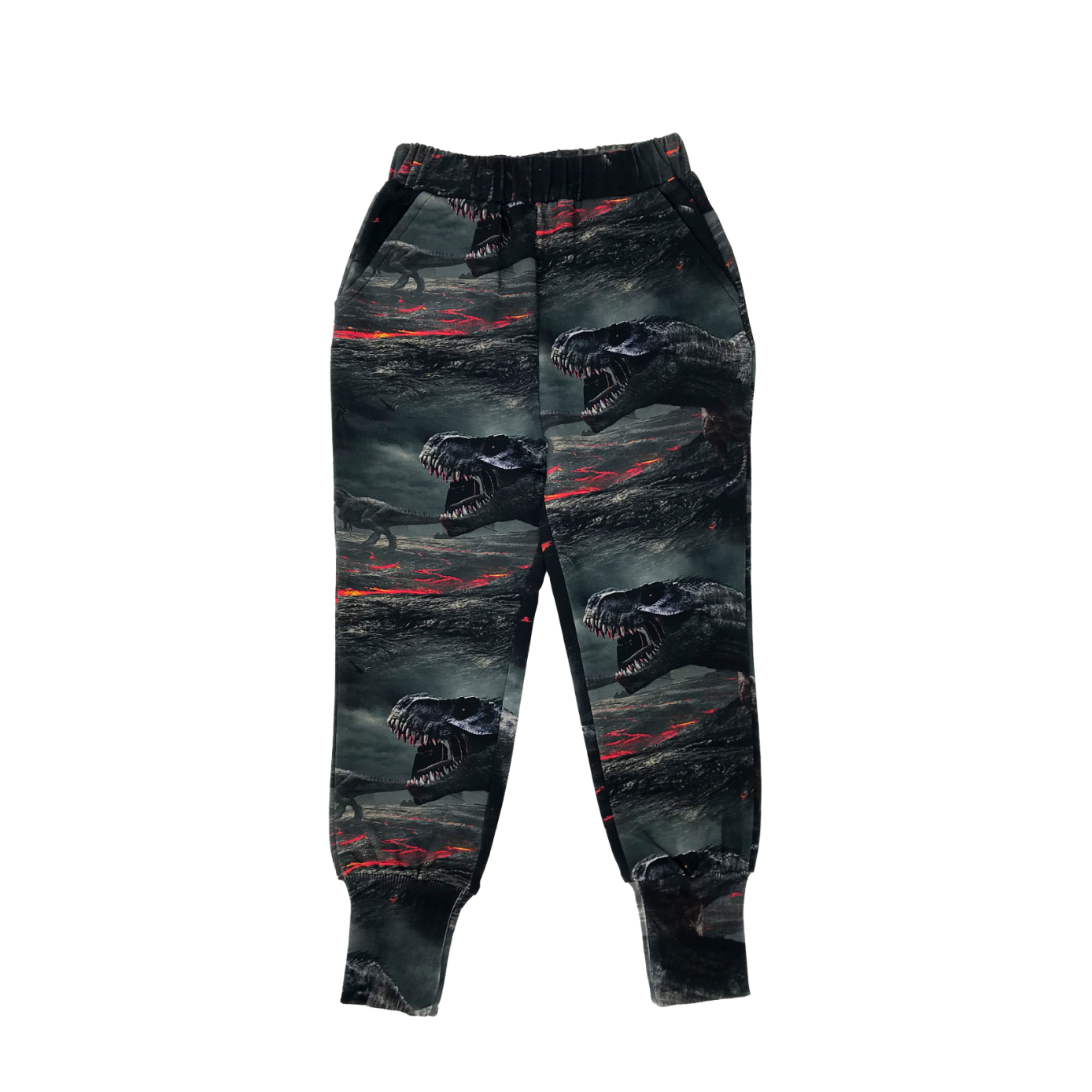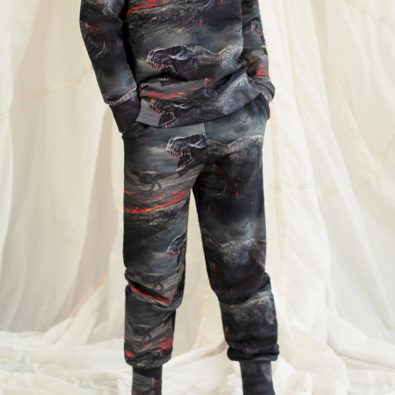A dinosaur goes rooooar. So do these pants. Not exactly, but they're pretty rad. For your movie loving, dinosaur roaring fan favorite. These sweatpants feature a photographic print, elastic waistband and cuffed ankles.