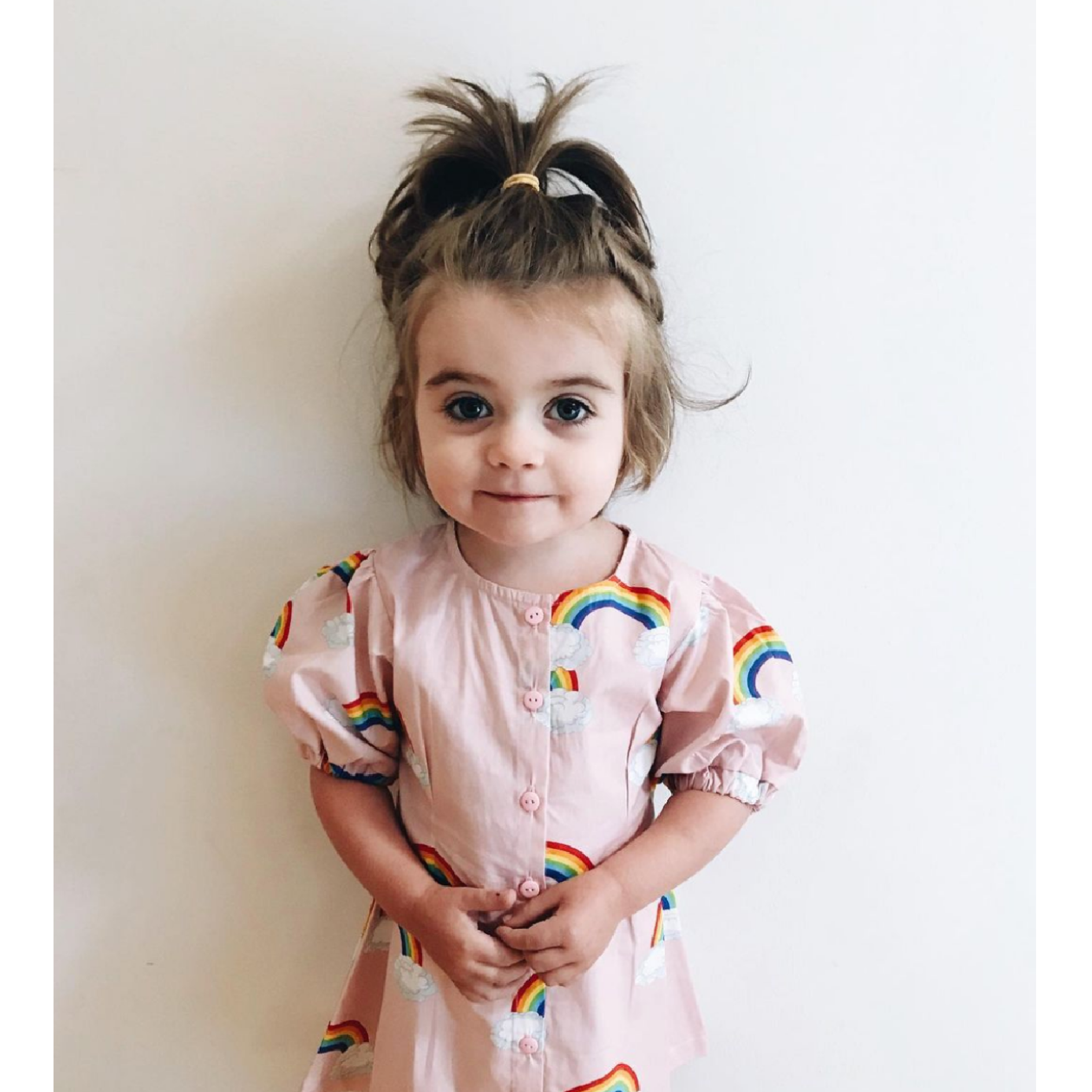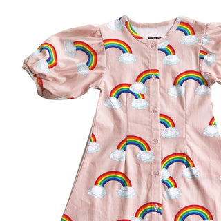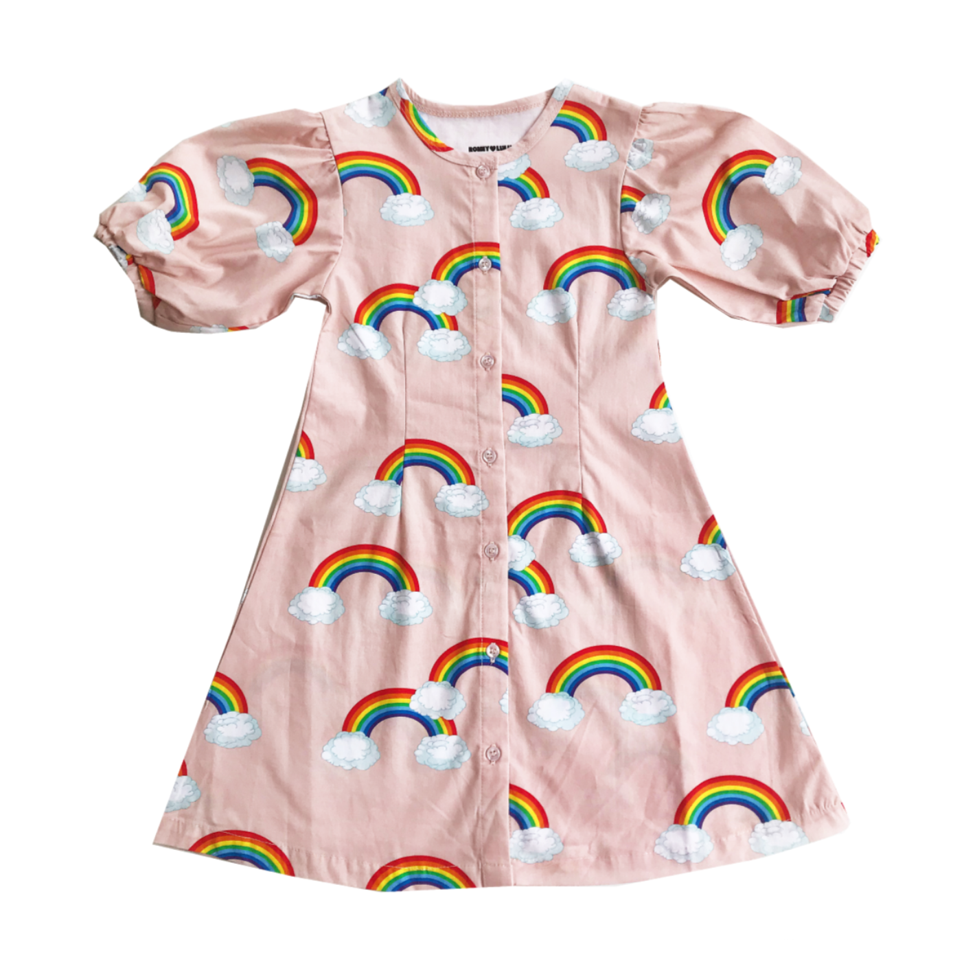 A rad all over rainbow print on an ultra chic puff sleeve dress. Rock with a pair of leggings as a tunic during cooler months or as the sweetest spring / summer dress!