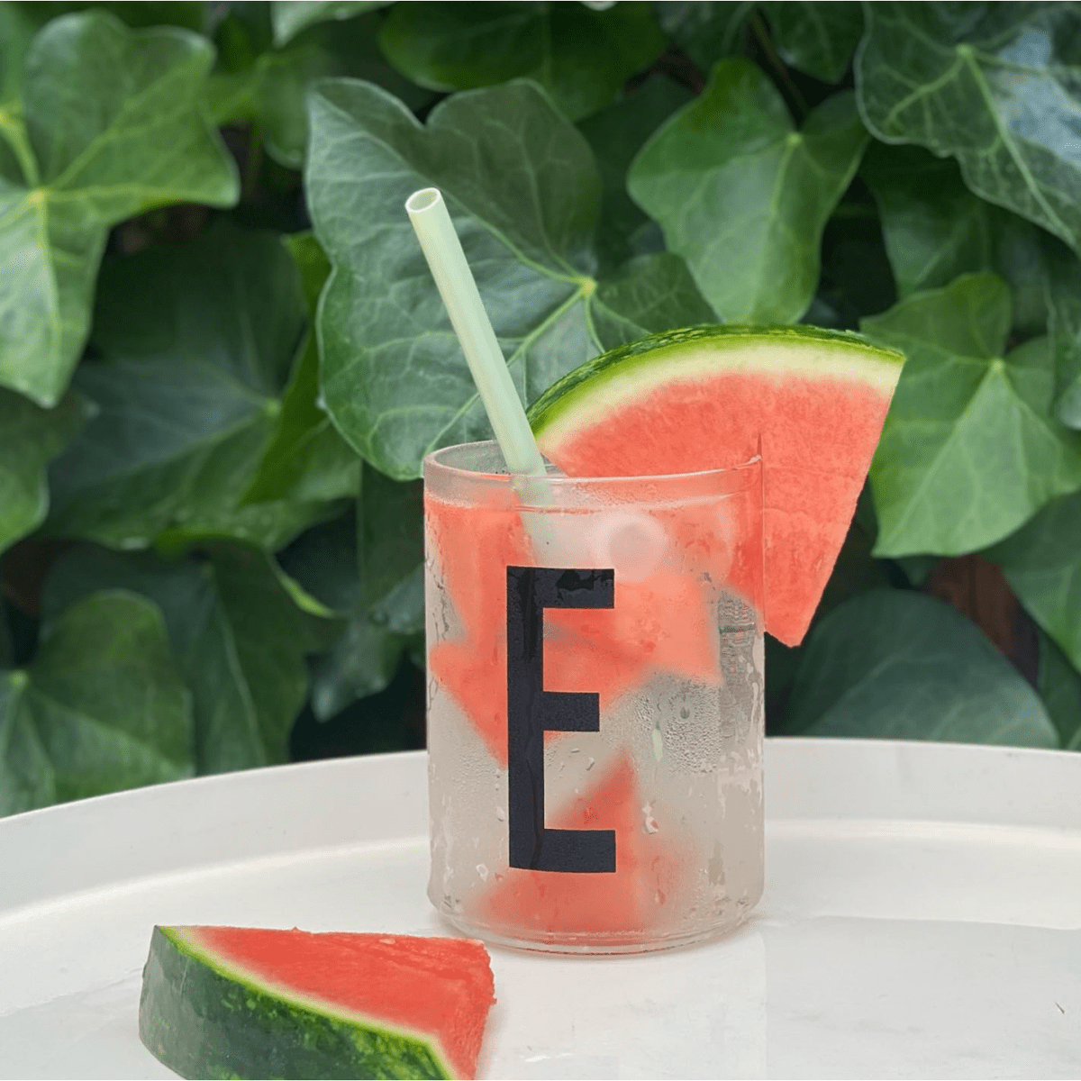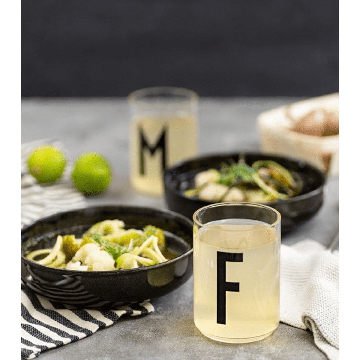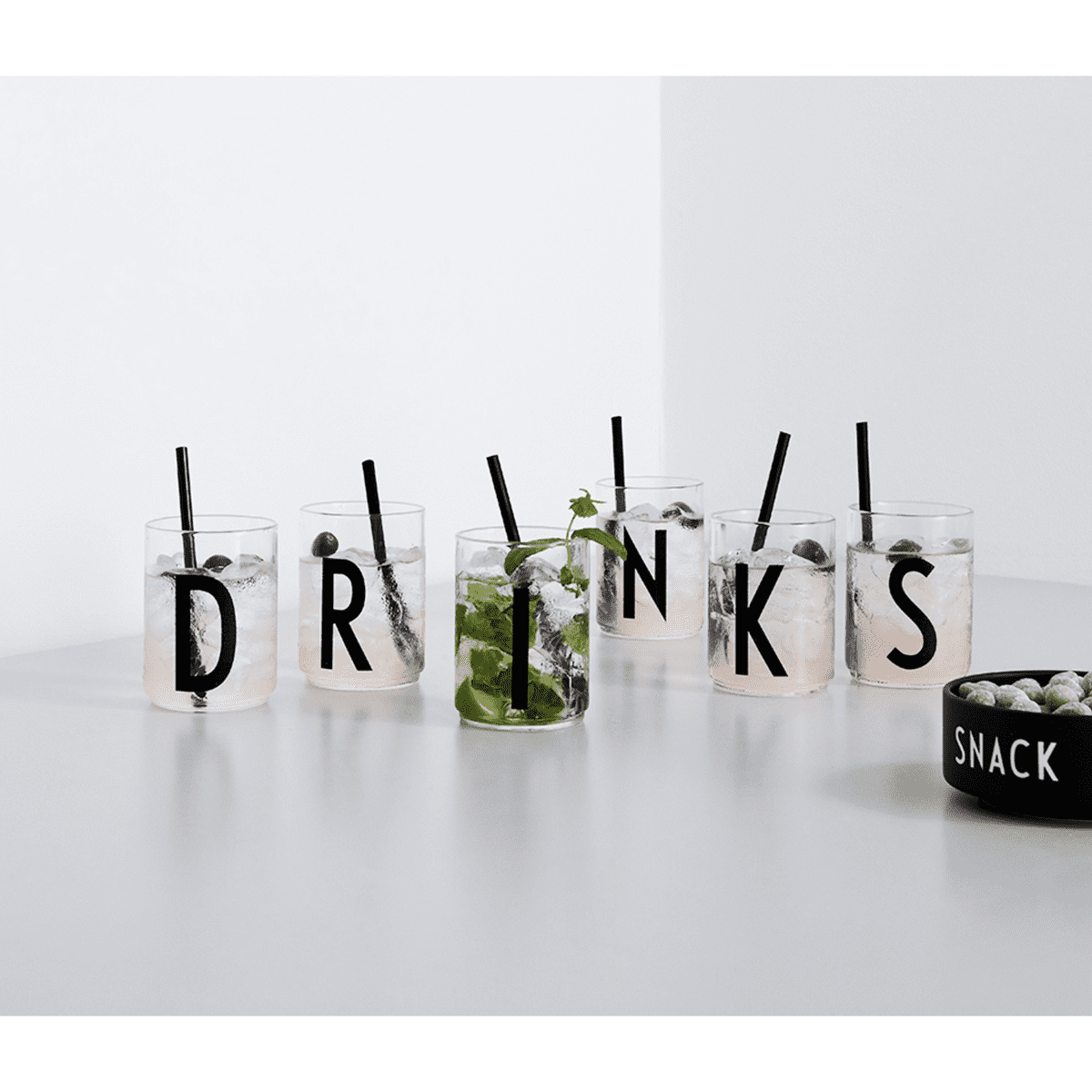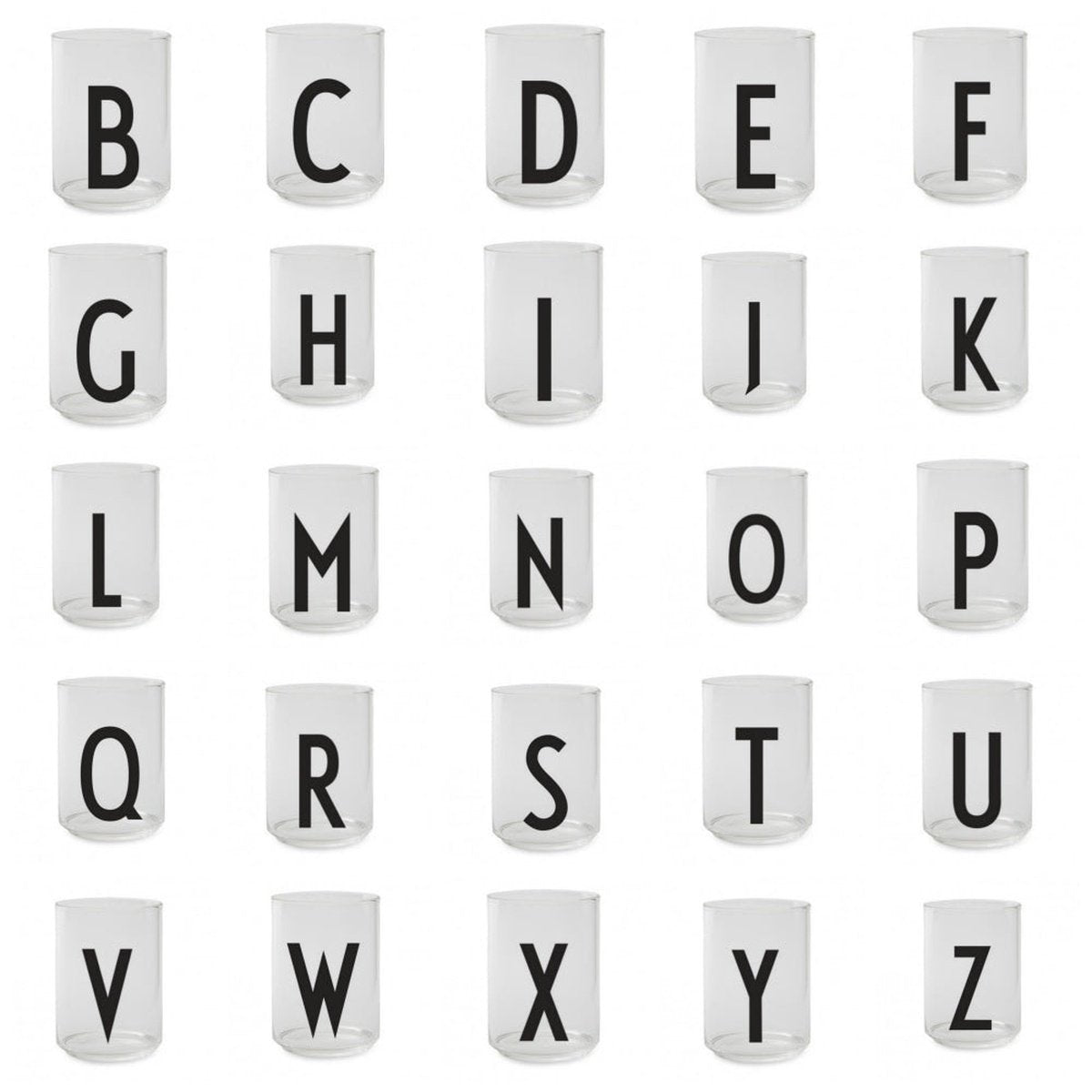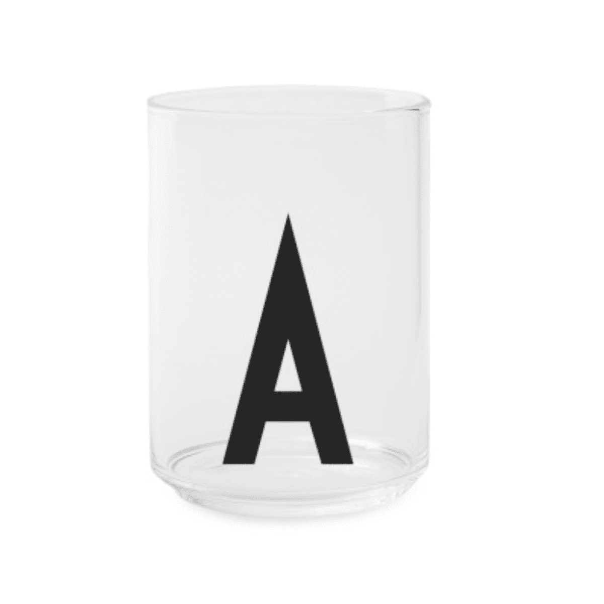 An iconic design from Denmark based on 1937 Arne Jacobsen Typography. Designed for the interior signage for the Aarhus City Hall, this angular, vertical and precise font was radically new in the pre-war years and still expresses the essence of Nordic modernism. A-Z letters adorn clear glass cups for drinking or decorating your favorite space.