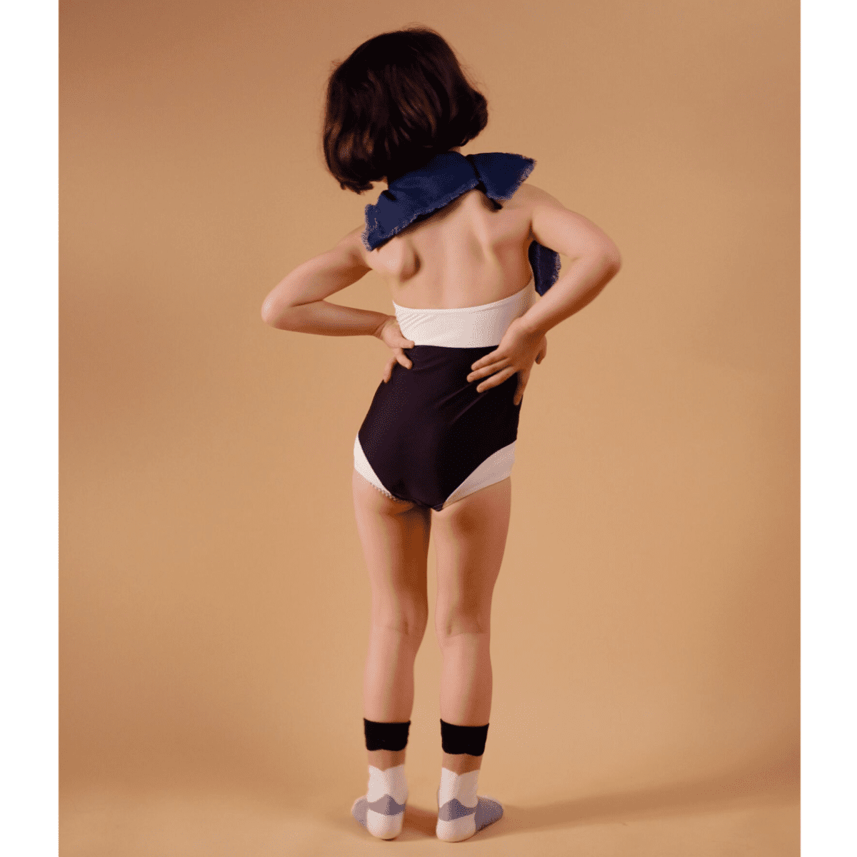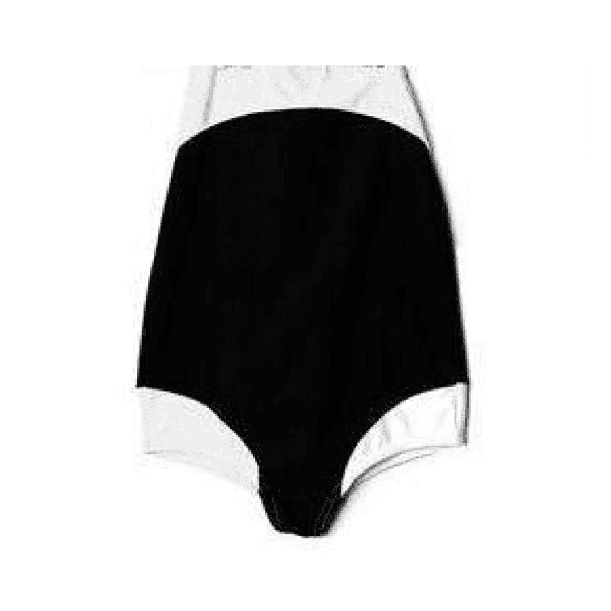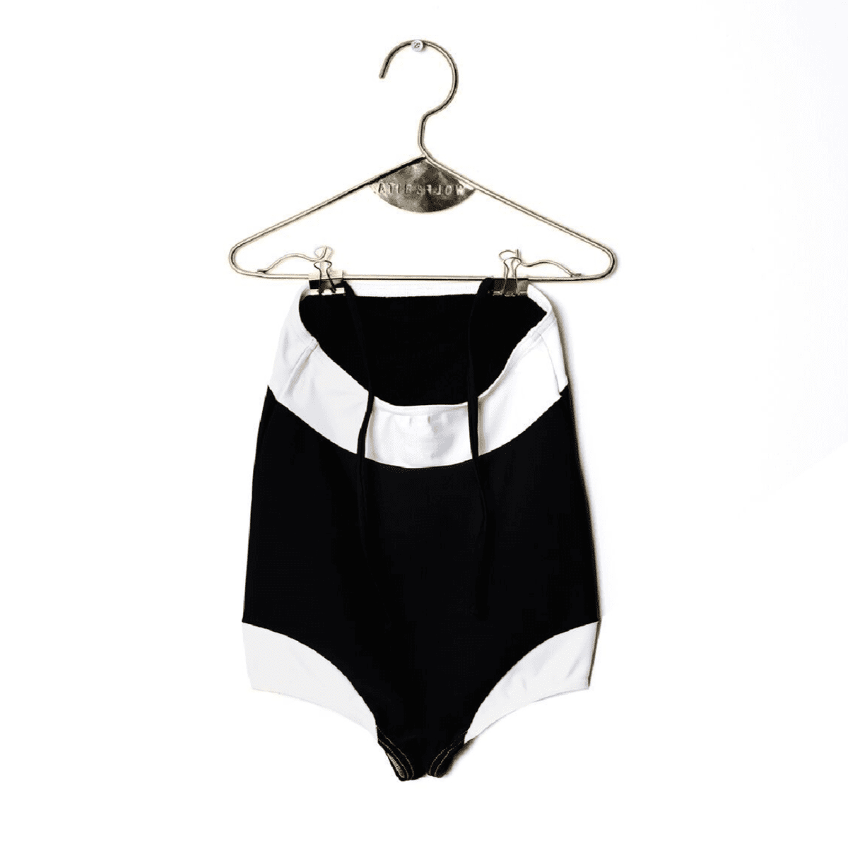 A perfectly chic and modern, black and white one-piece bathing suit with black straps that flatters all babes of all ages.