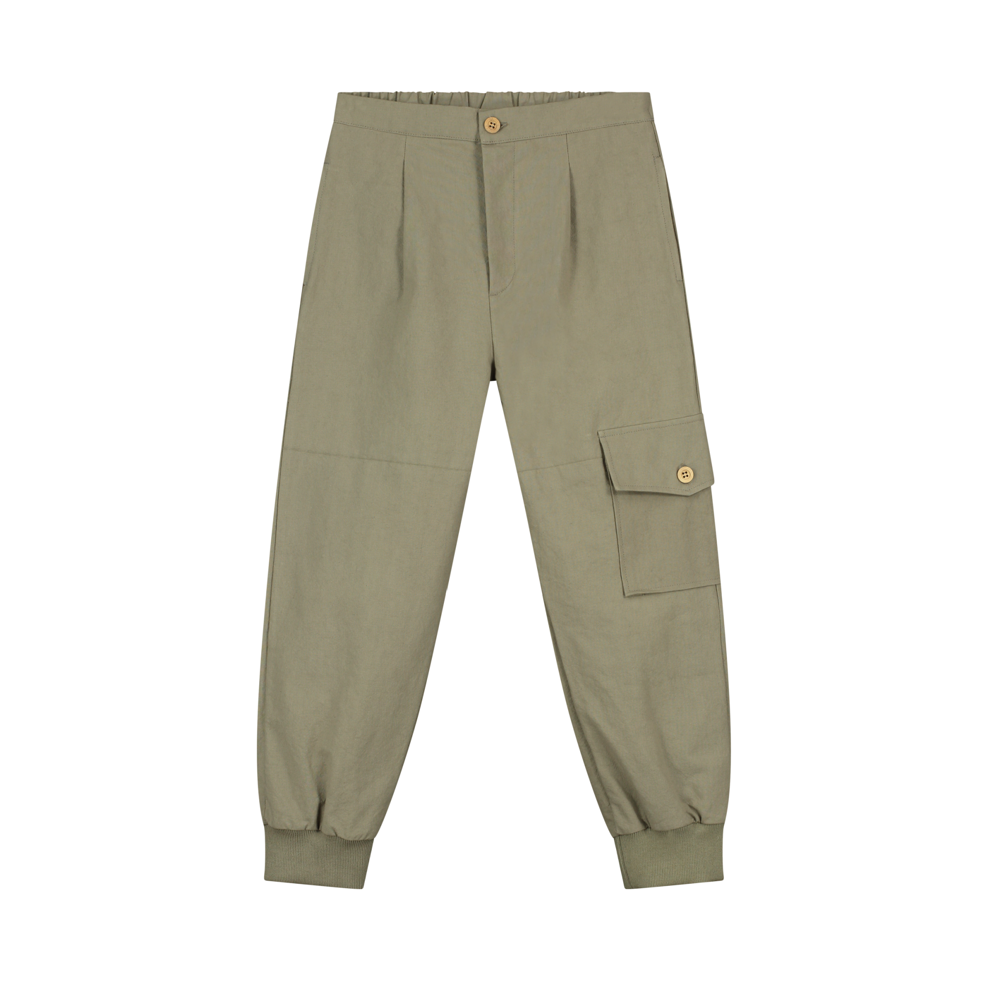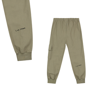 A rad and luxe cargo pants featuring an elastic button front, side pocket, ribbed ankles and minimal, but bold text on the back leg.