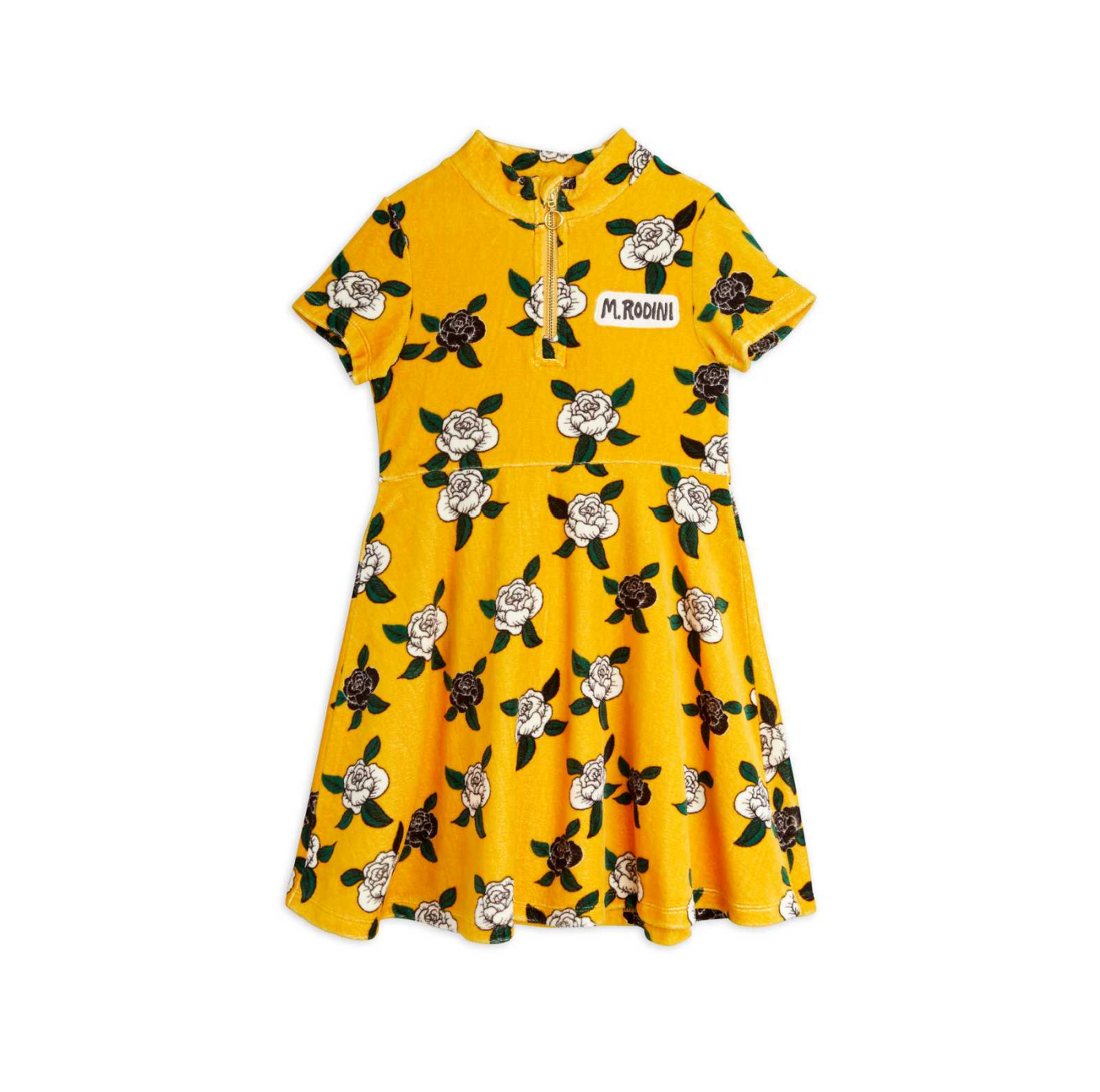 Yellow dress in velour with an all-over Rose print, made from 100 % GOTS certified organic cotton velour. Designed with a half zipper, high neck and an embroidered M.Rodini patch at the chest.