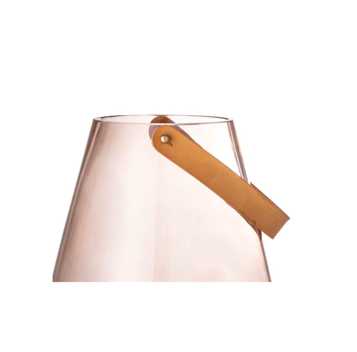 A uniquely shaped glass lantern with a leather handle for easy carry. This comes in a smokey blush colored glass. Carry it in and outside, great for the barbeque nights.