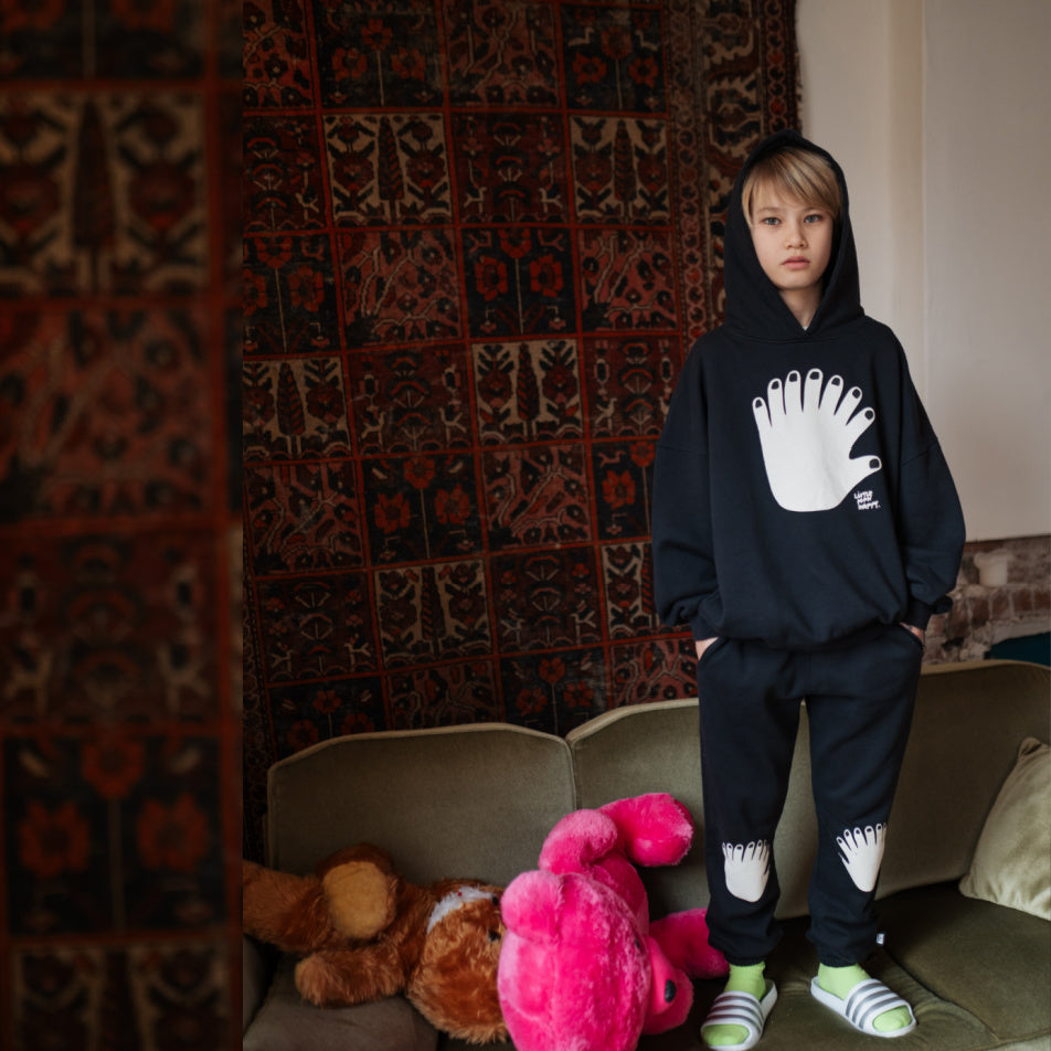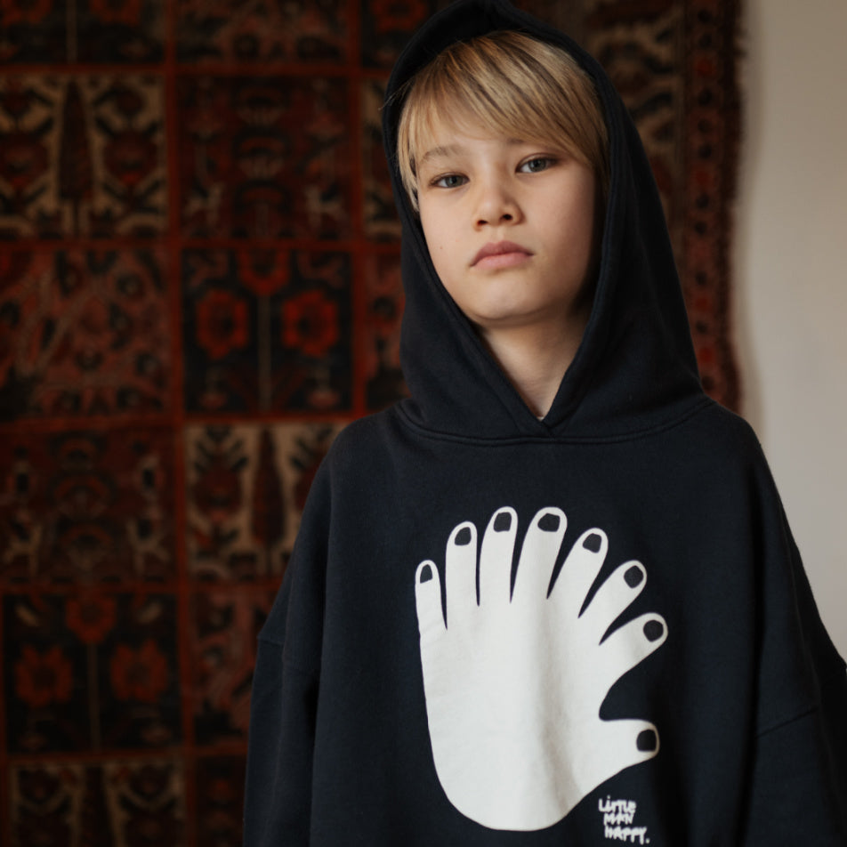 An oversized and super unique hooded sweatshirt with a cool handprint on the front and pockets. Designed to express creativity, curiosity, and the boldness of all ages.