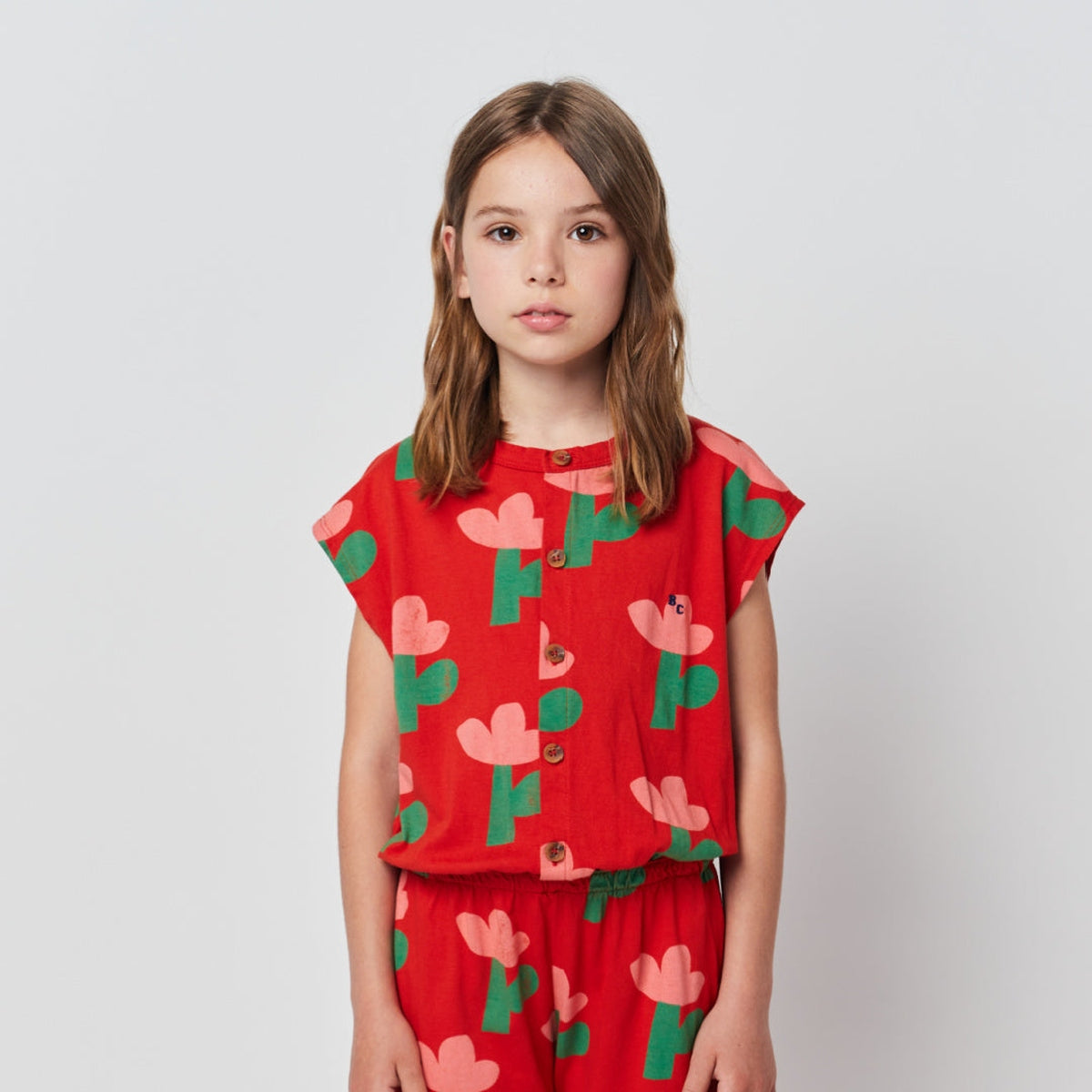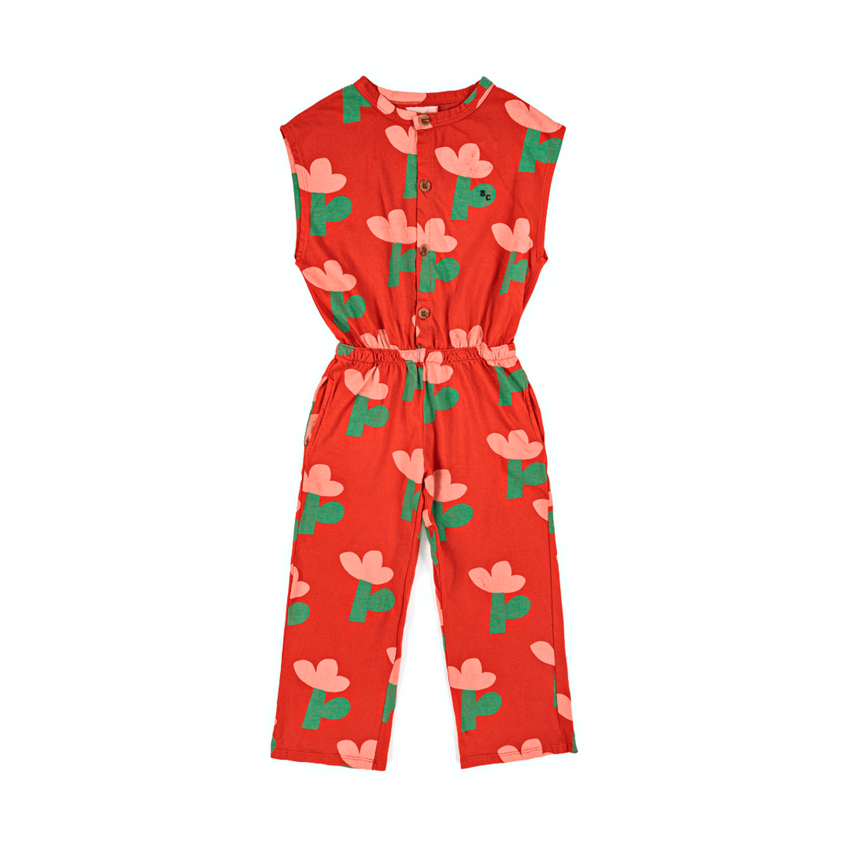 This gorgeous jumpsuit features an all over flower print with a red base, cinched elastic waist, and button front. The subtle cap sleeves add the sweetest touch.