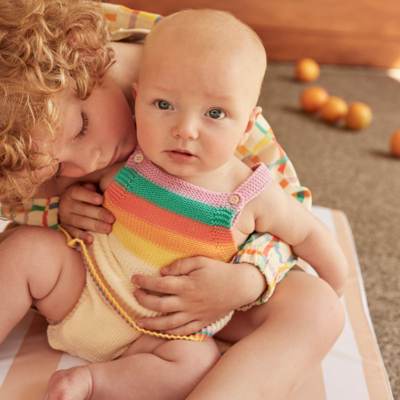 Designed with both style and sustainability in mind, with adjustable straps that allows plenty of room to grow and tiny buttons at the crotch for easy dressing and diaper changing.