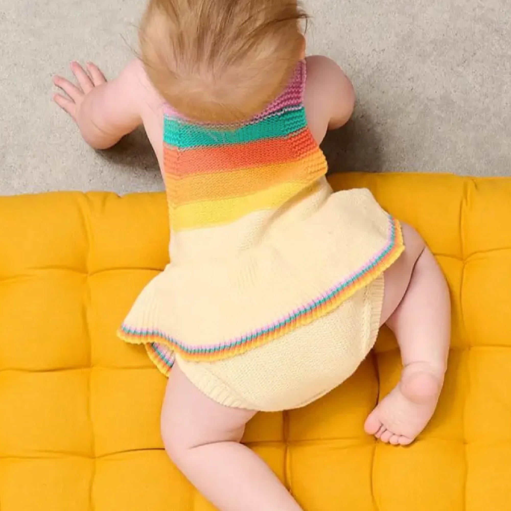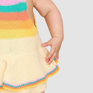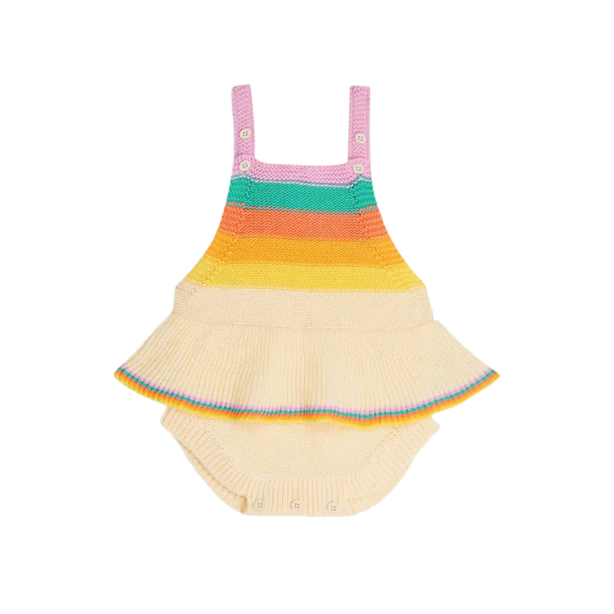 This beautifully soft knitted baby suit has a joyous rainbow vintage hand knit feel and is a perfect heirloom baby gift for those that love a pop of color and little ruffle!