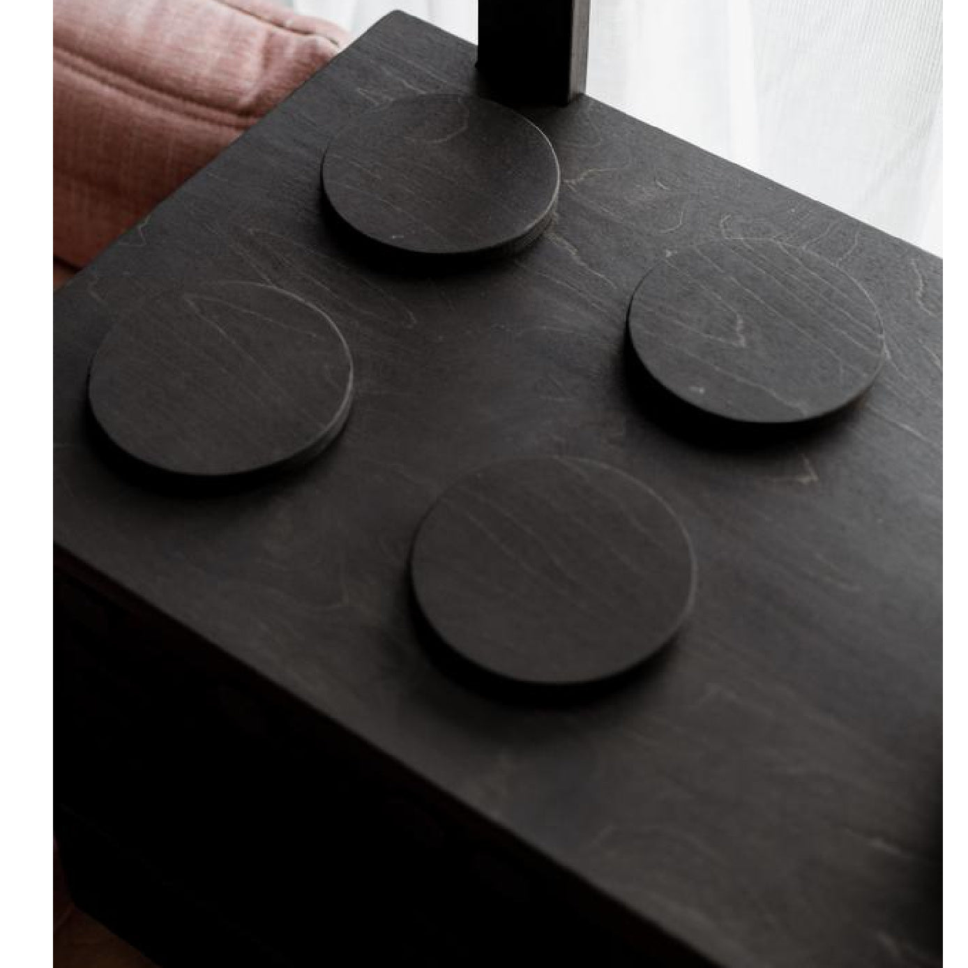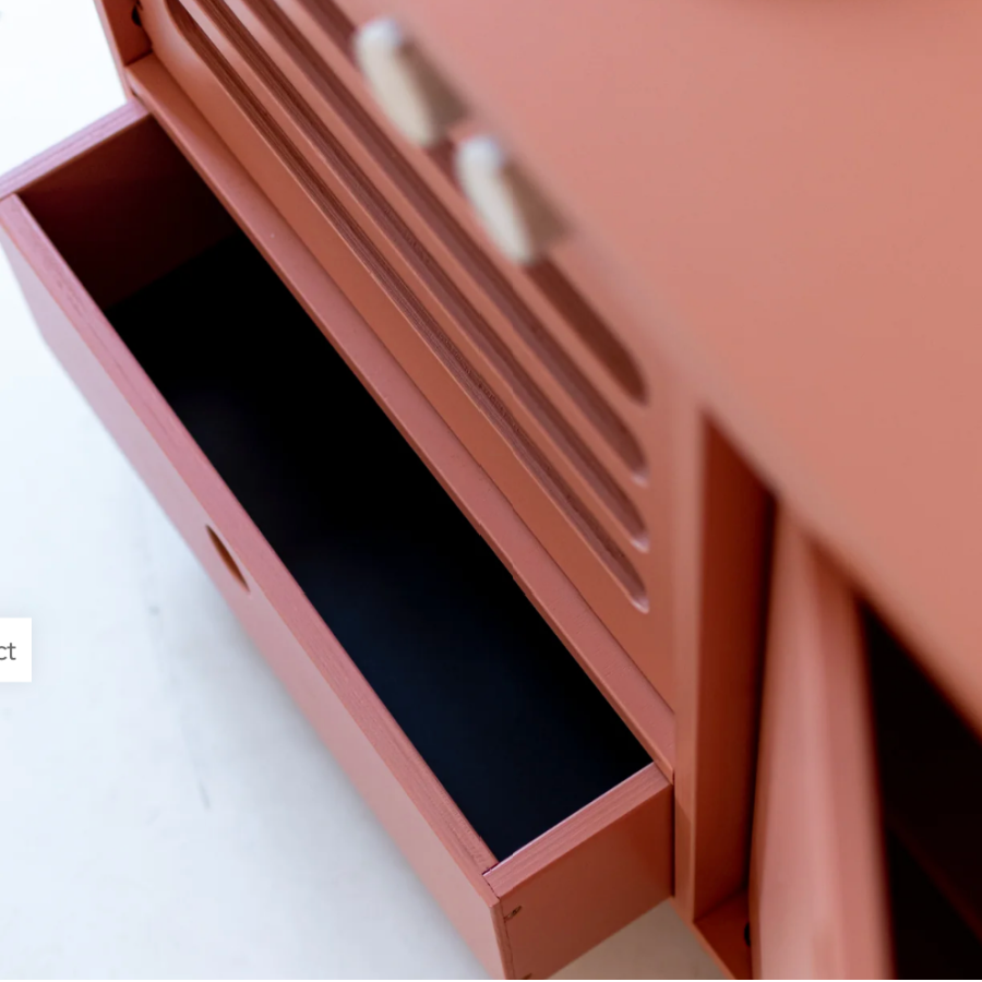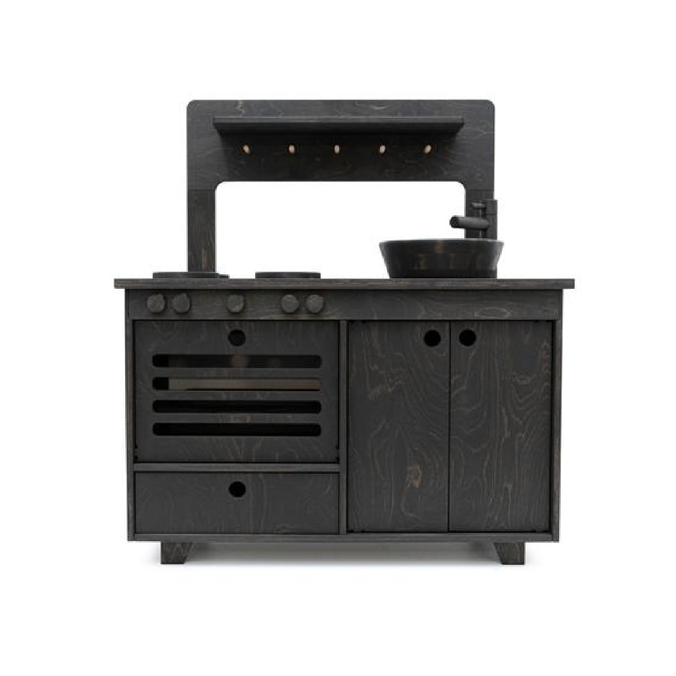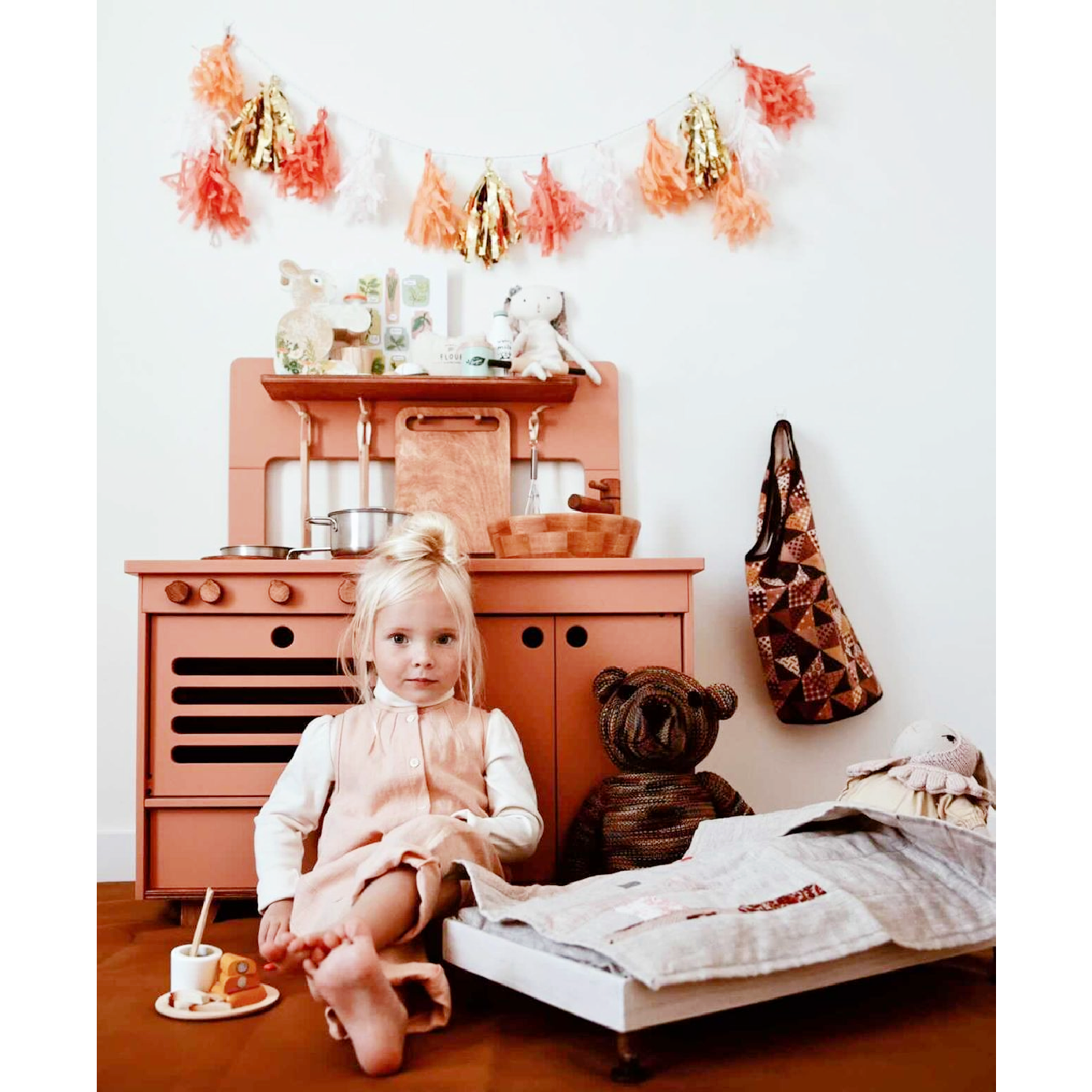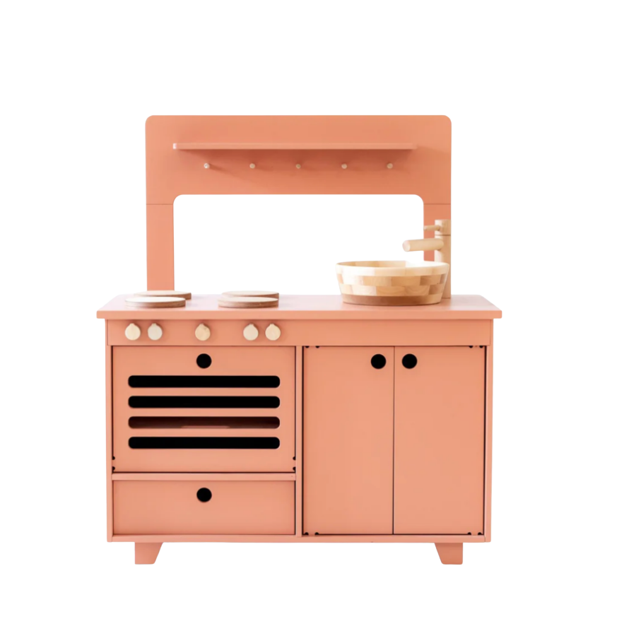 A handcrafted play kitchen featuring an oven, cupboard, hob, sink, water tap, and drawer. The surface is coated with a unique plant-based hard-wax oils and stains produced in Belgium called Rubio Monocoat.