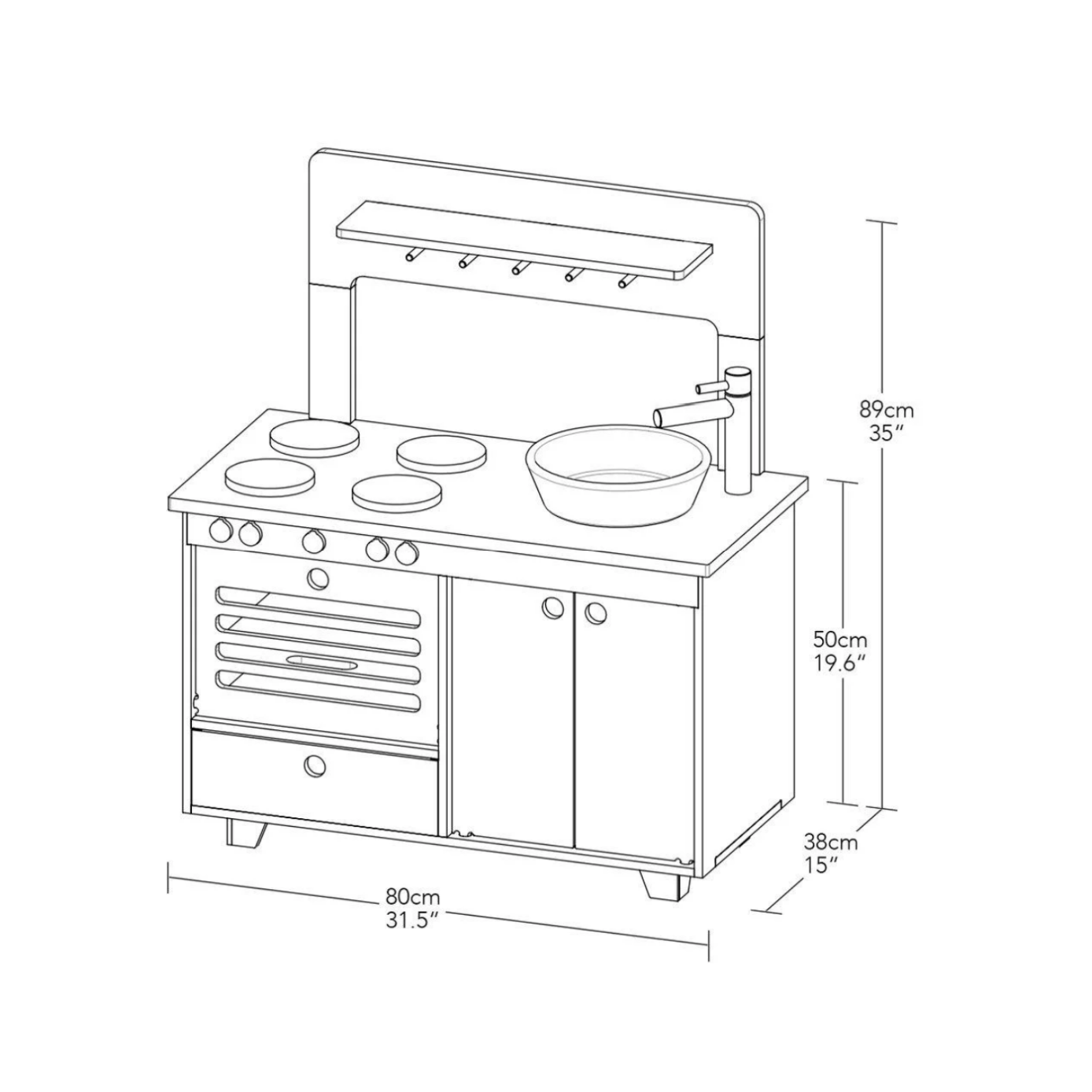 Inspire your little chef or baker with their own little kitchen. The surface has enough space for them to make a 'bake' which can then be popped in the oven (with magnetic door) or set on the hob to 'cook'. Utensils and equipment can then be packed away in the handy cupboard or placed on the rack above the sink.
