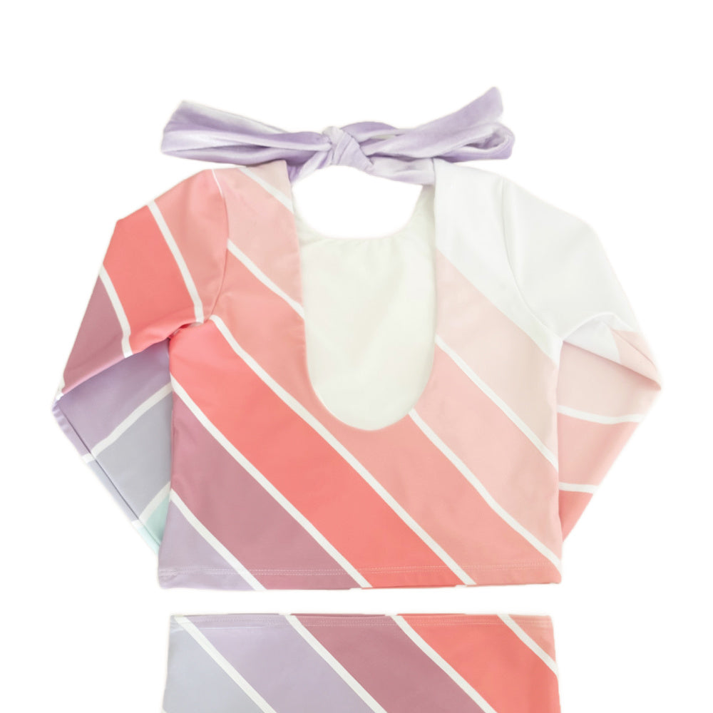 Rainbow stripes meets all-day play. Featuring a scoop back, sun protecting long sleeves, adjustable velour back strap, excellent sun protection, and the ultimate comfort, this girls' two piece long sleeve swimsuit will keep them protected and surf stylish. This beautiful long sleeve children's bathing suit set maximizes flexibility, keeps your little one cool, and adds extra comfort for easy changing in and out while wet.