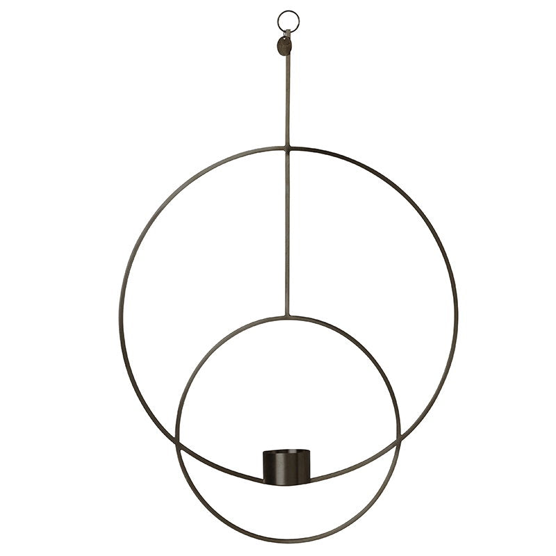This candle holder displays an exercise in mastering the art of balance with each part counter weighing the other to reach a moment of tranquil stillness. The geometrical shapes are both sculptural and functional elements, as the arch may be used as a handle to carry the candle holder.
