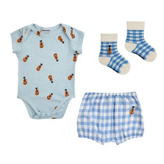 For your sweet little music loving babe! This beautiful set comes with a vichy short, all over printed, organic bodysuit and Vichy prints, with embroidered socks. It's the sweetest set and makes for the perfect little gift!