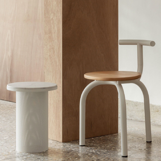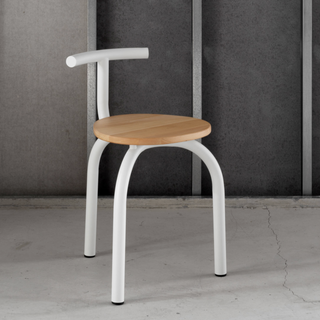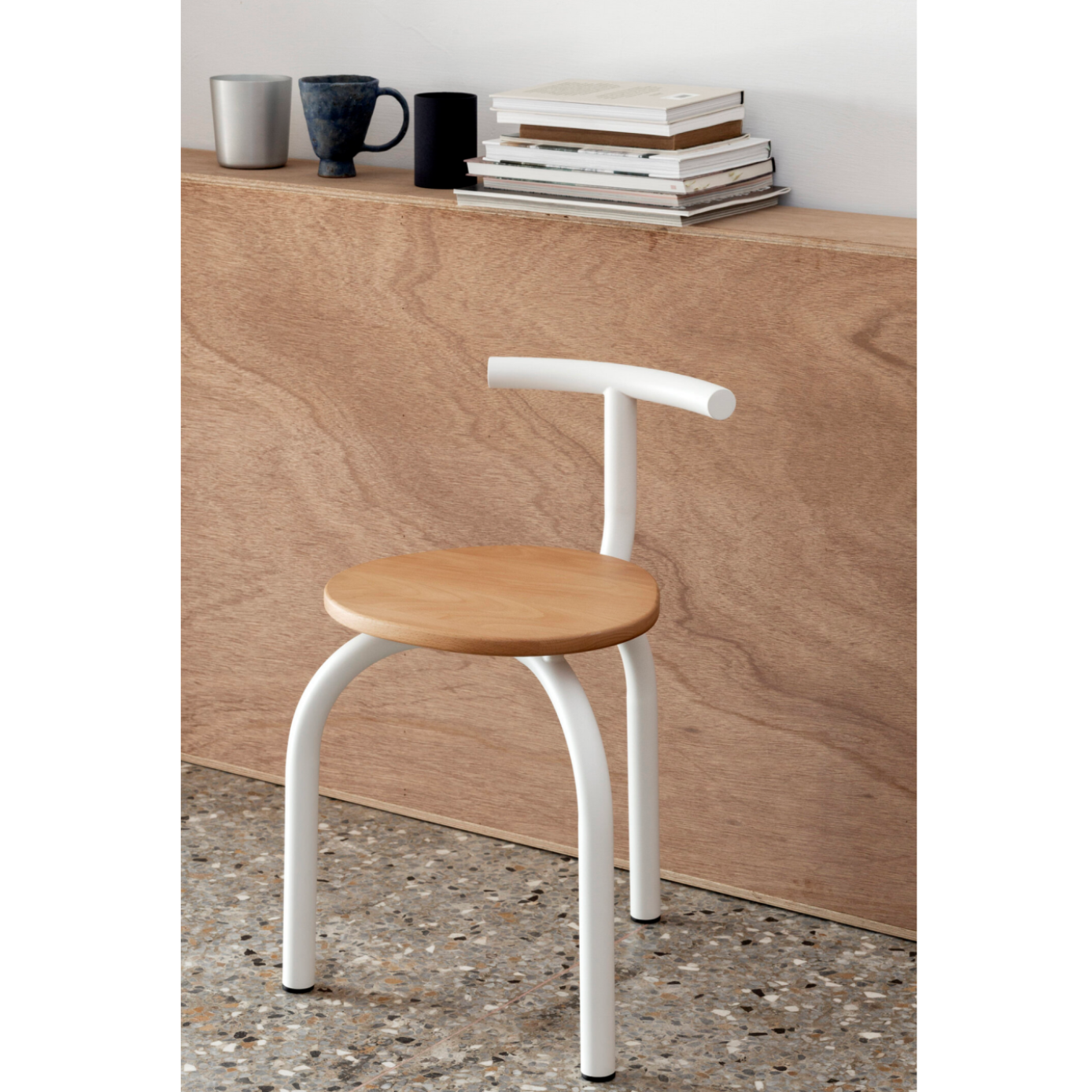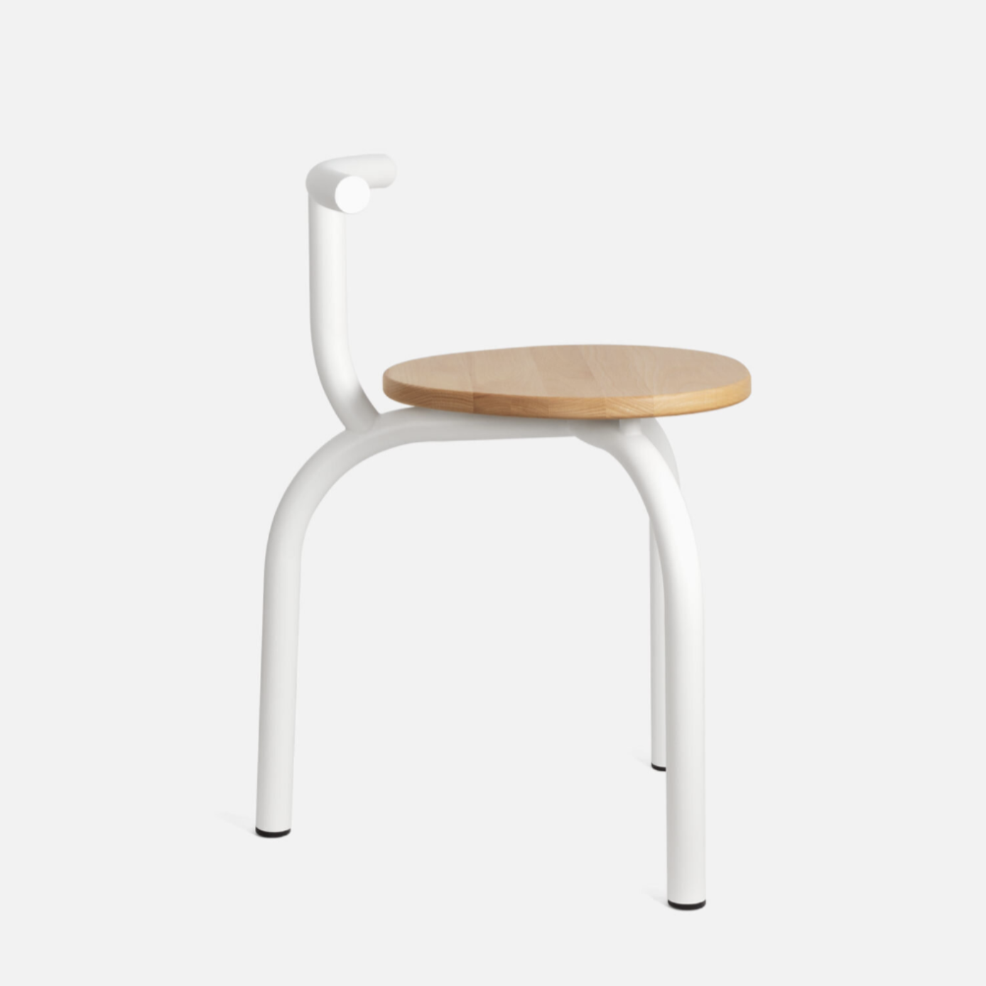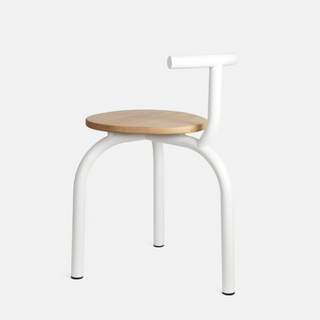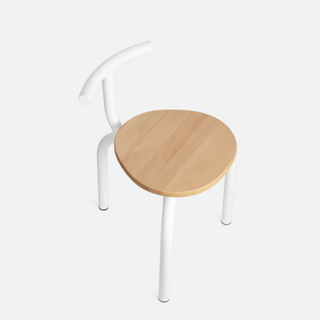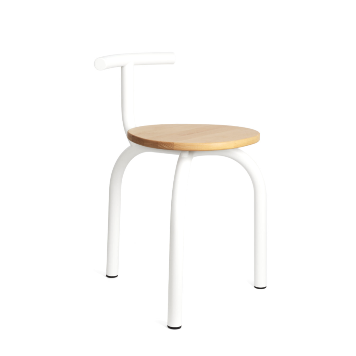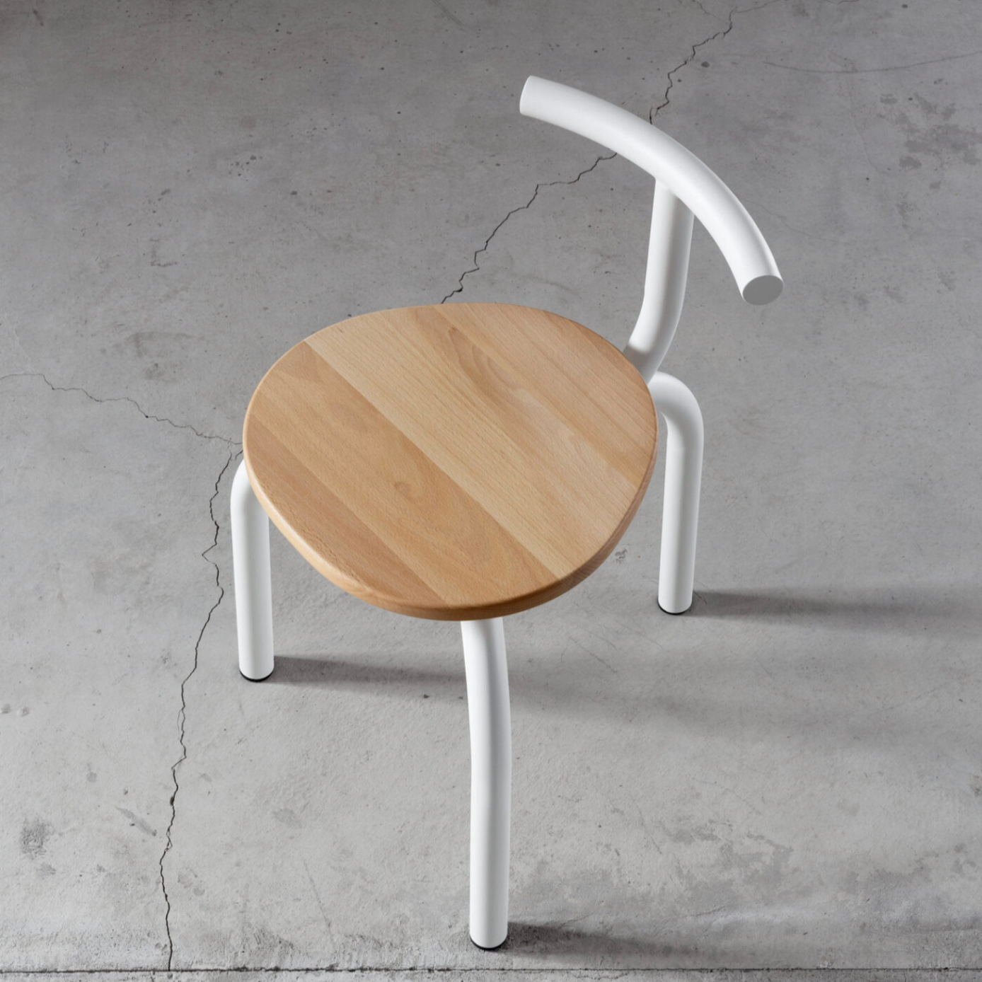 Its a three-legged chair constructed from fine welded cylinder tubes to support stability with a beech wood plate serving as the seat. The curious looking backrest is set relatively low in order to support lower back and to ensure a well-balanced usage. The backrest giving the freedom on how user would like to sit in different ways, also functions as a handle to carry around. Thus fits well into cafés and other dynamic venues.