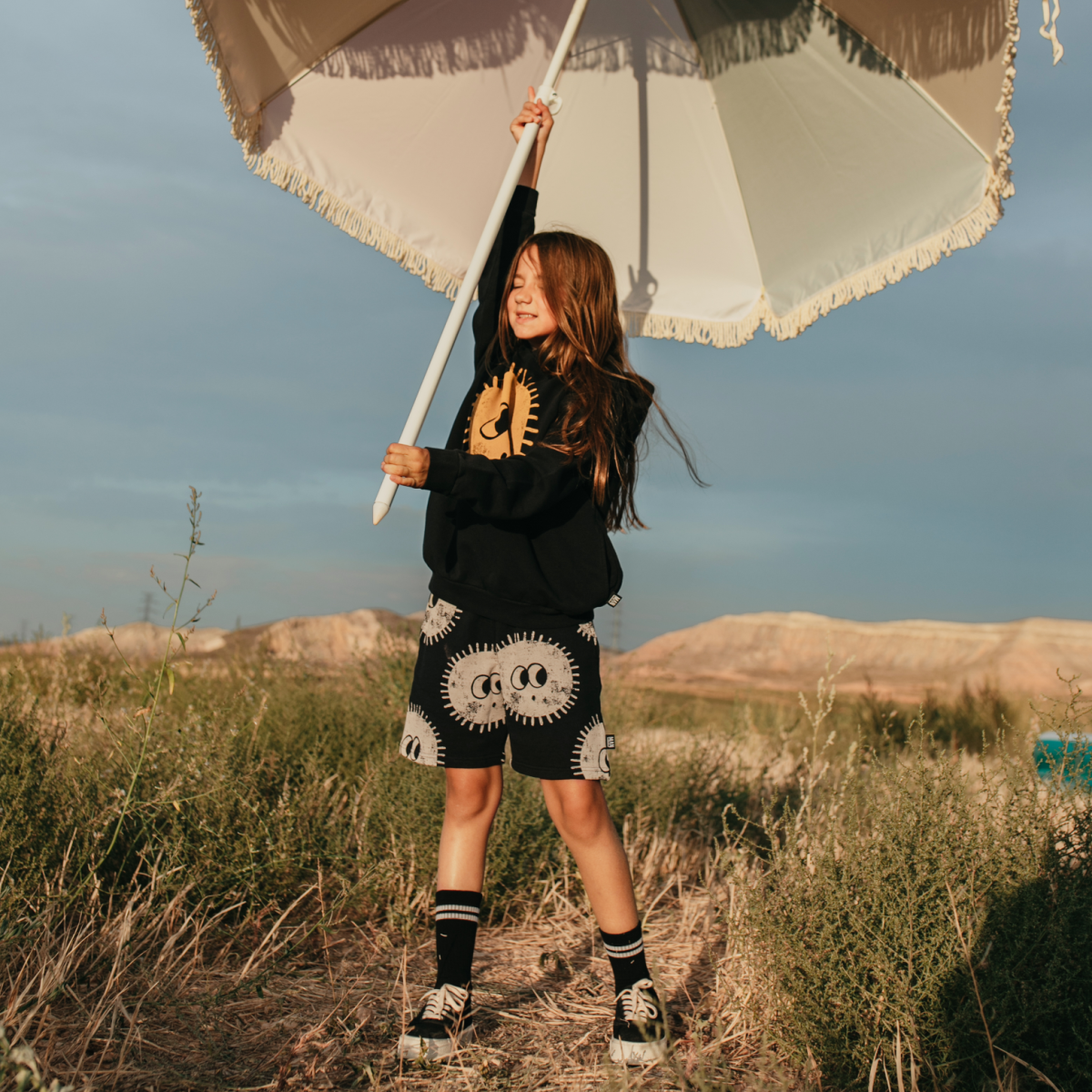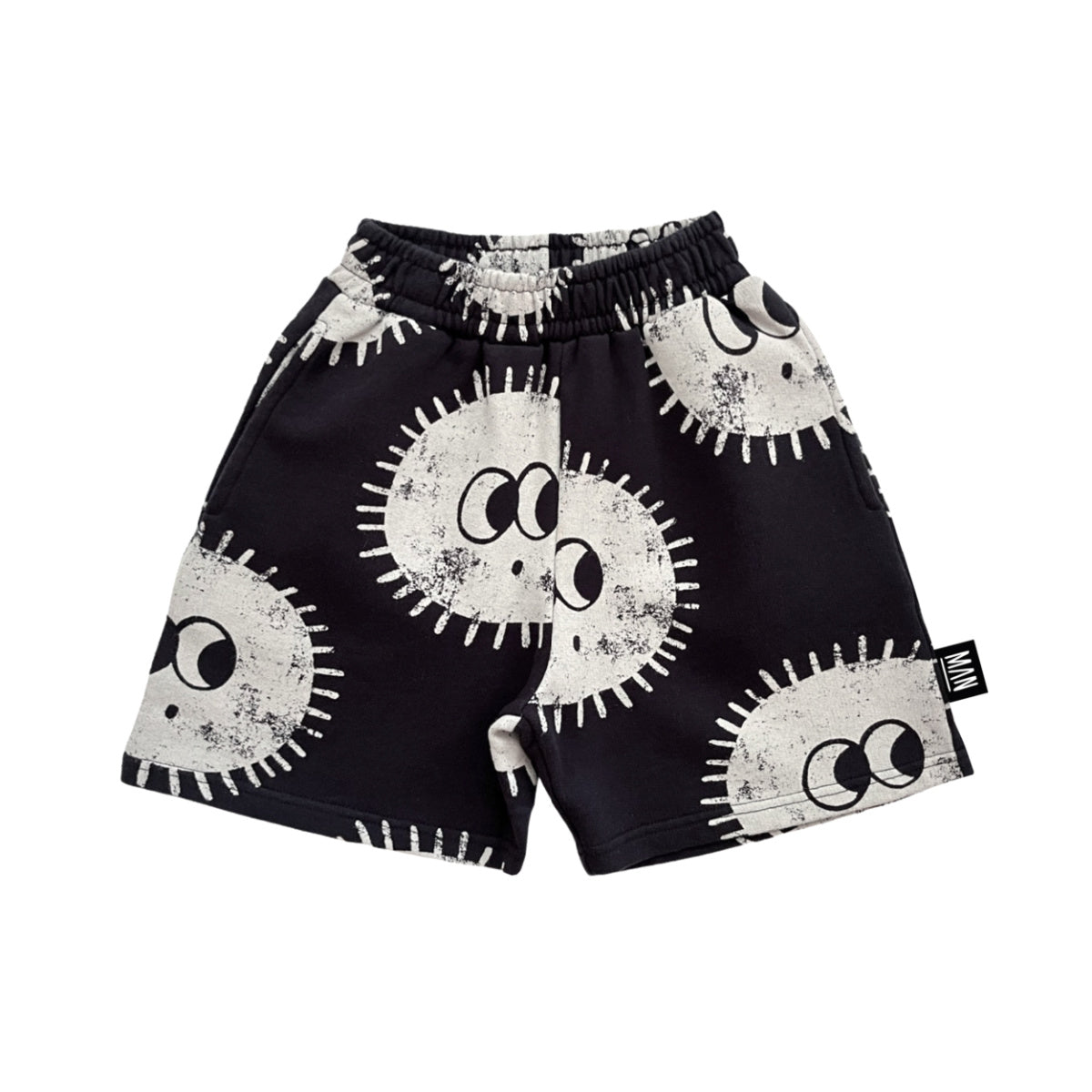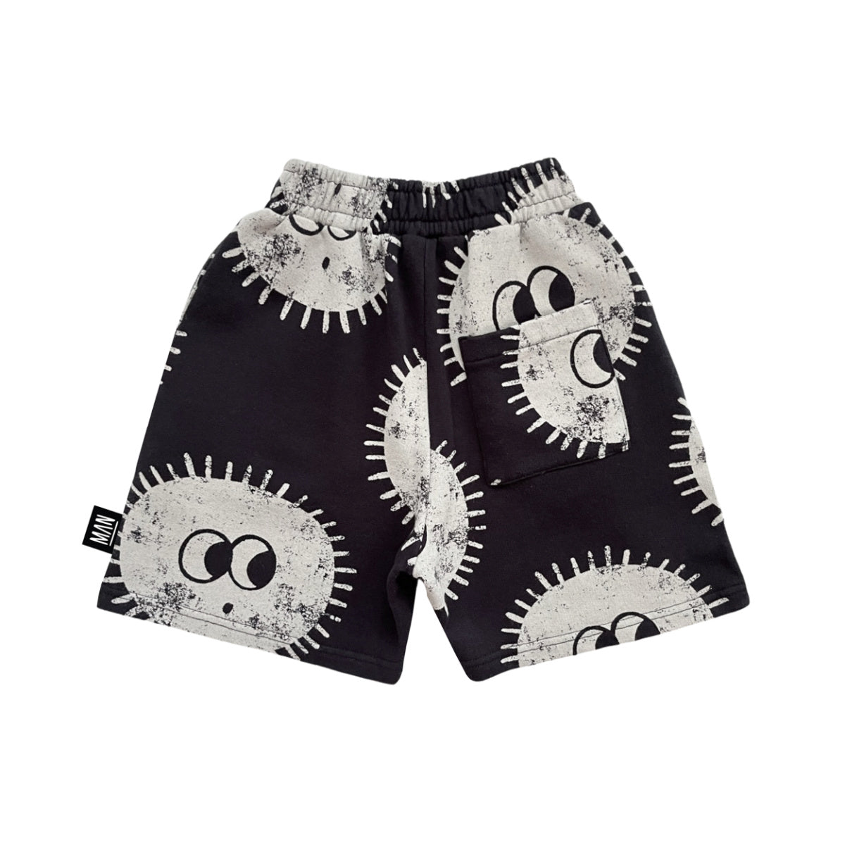 These rad board shorts feature a soft, comfortable relaxed fit, elastic waistband, side and back pockets. The unique all over sun print features a fun face on a black base.