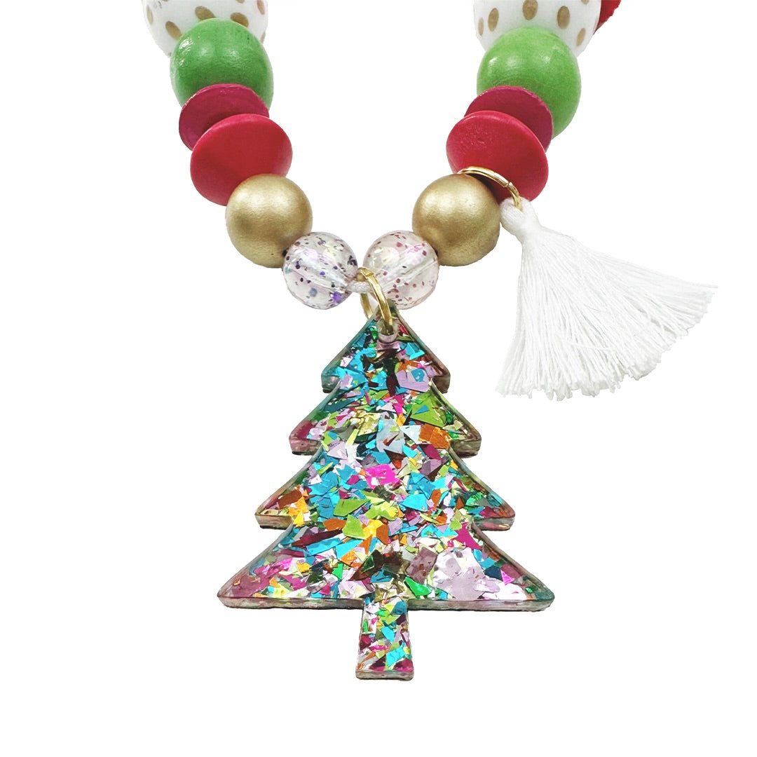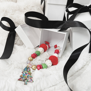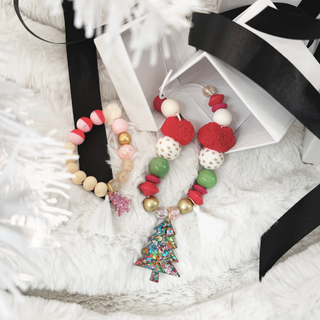 Celebrate the holidays with a little cheer. Each necklace is hand beaded in the USA with a mix of wood and/or acrylic beads, unique charms, and a matching tassel. Makes for a great stocking stuffer and sparkly fun during the holidays!