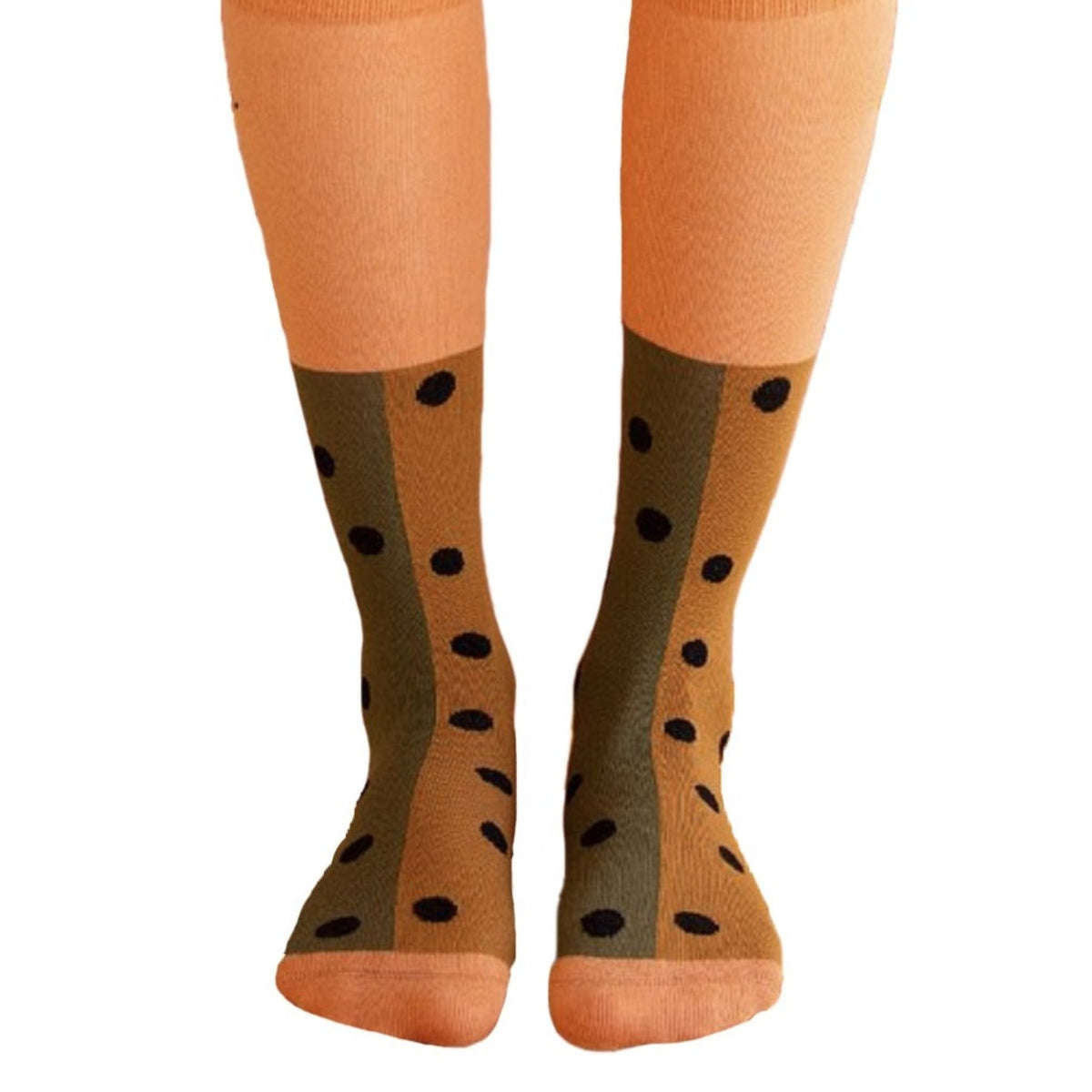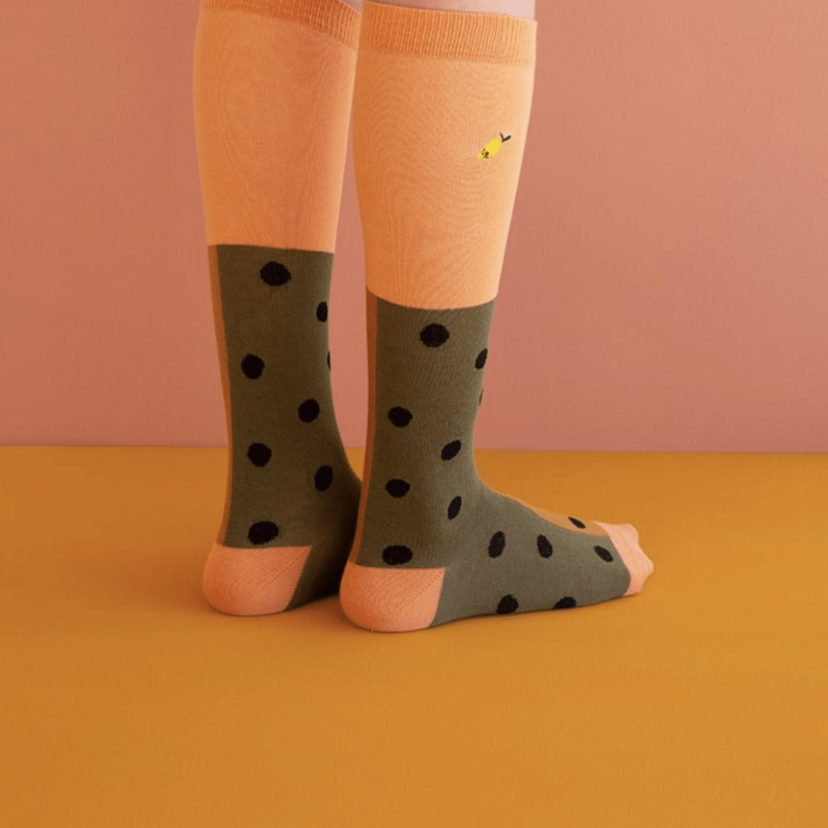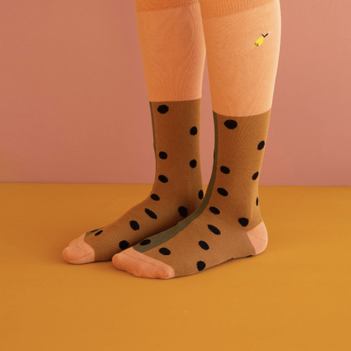 A chic pair of mis-match knee high socks featuring a black sprinkle design and striped pattern in caramel brown.