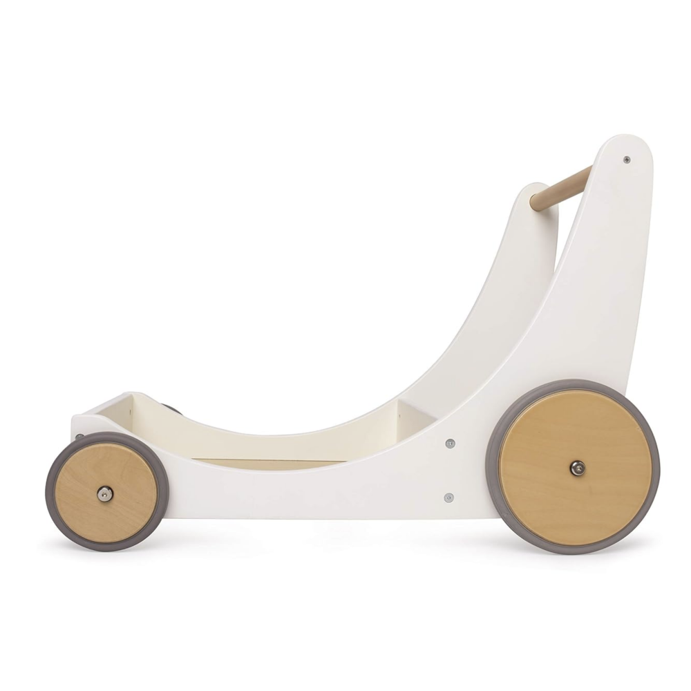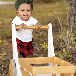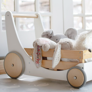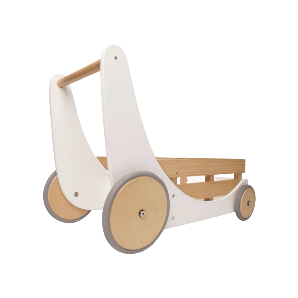 The perfect toy that serves as both a storage wagon for toys and stuffed friends and a walker for newly-mobile children. Handmade with replenish able birch wood, styled with sustainably-painted beechwood sides, fitted with adjustable wheels that have rubber trim to prevent scratches and sitting at a handlebar height of 17 inches (43 centimeters), the  cargo walker is an unrivaled option for your tiny tot!