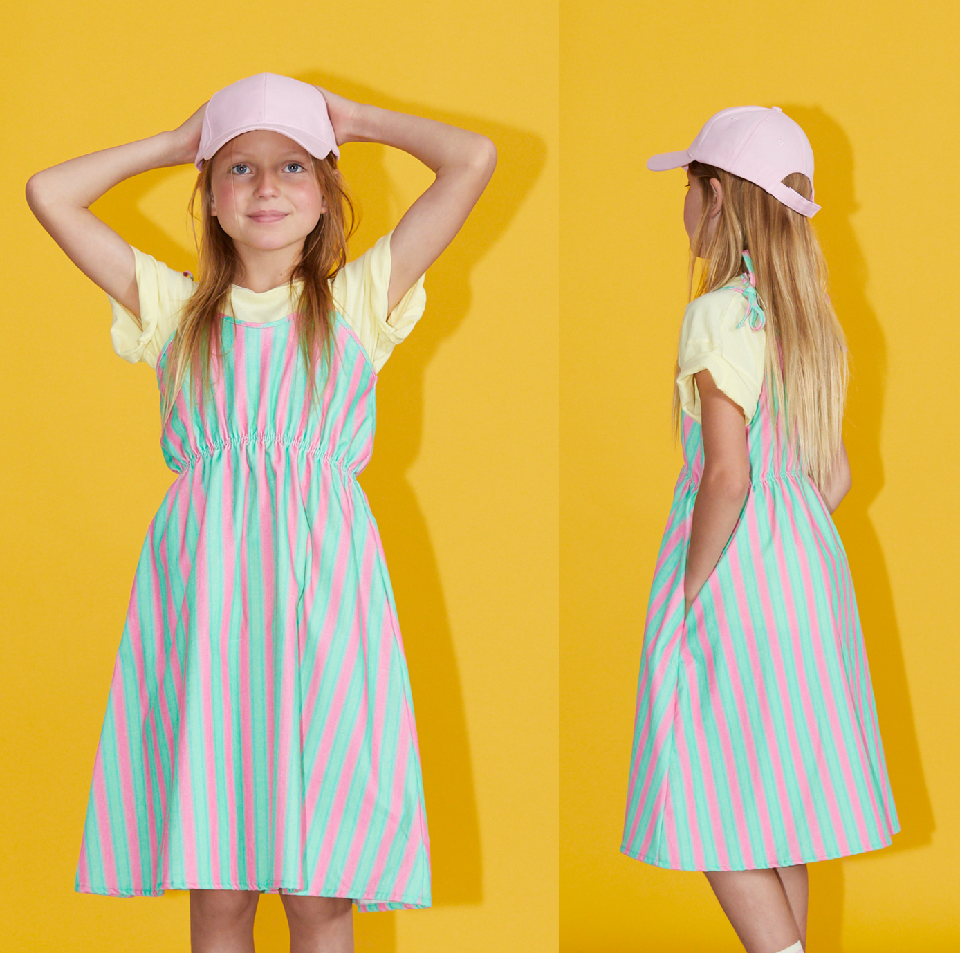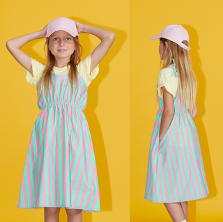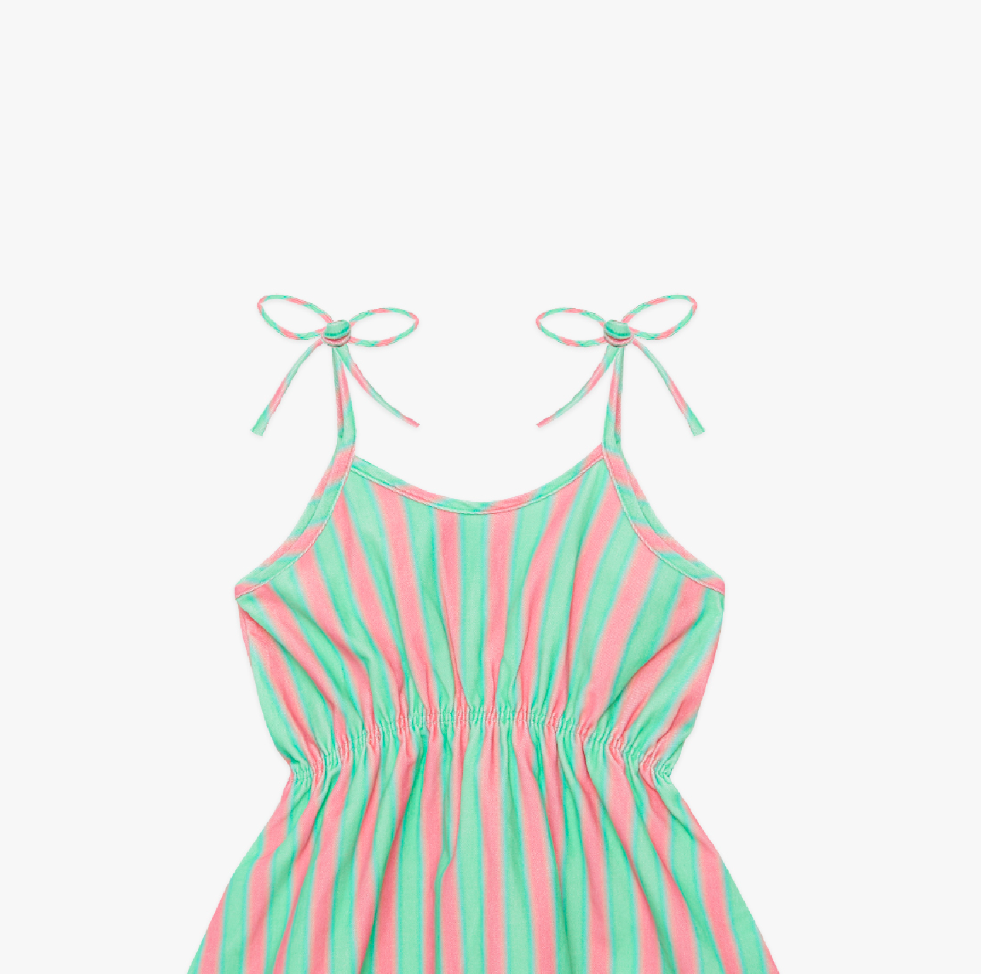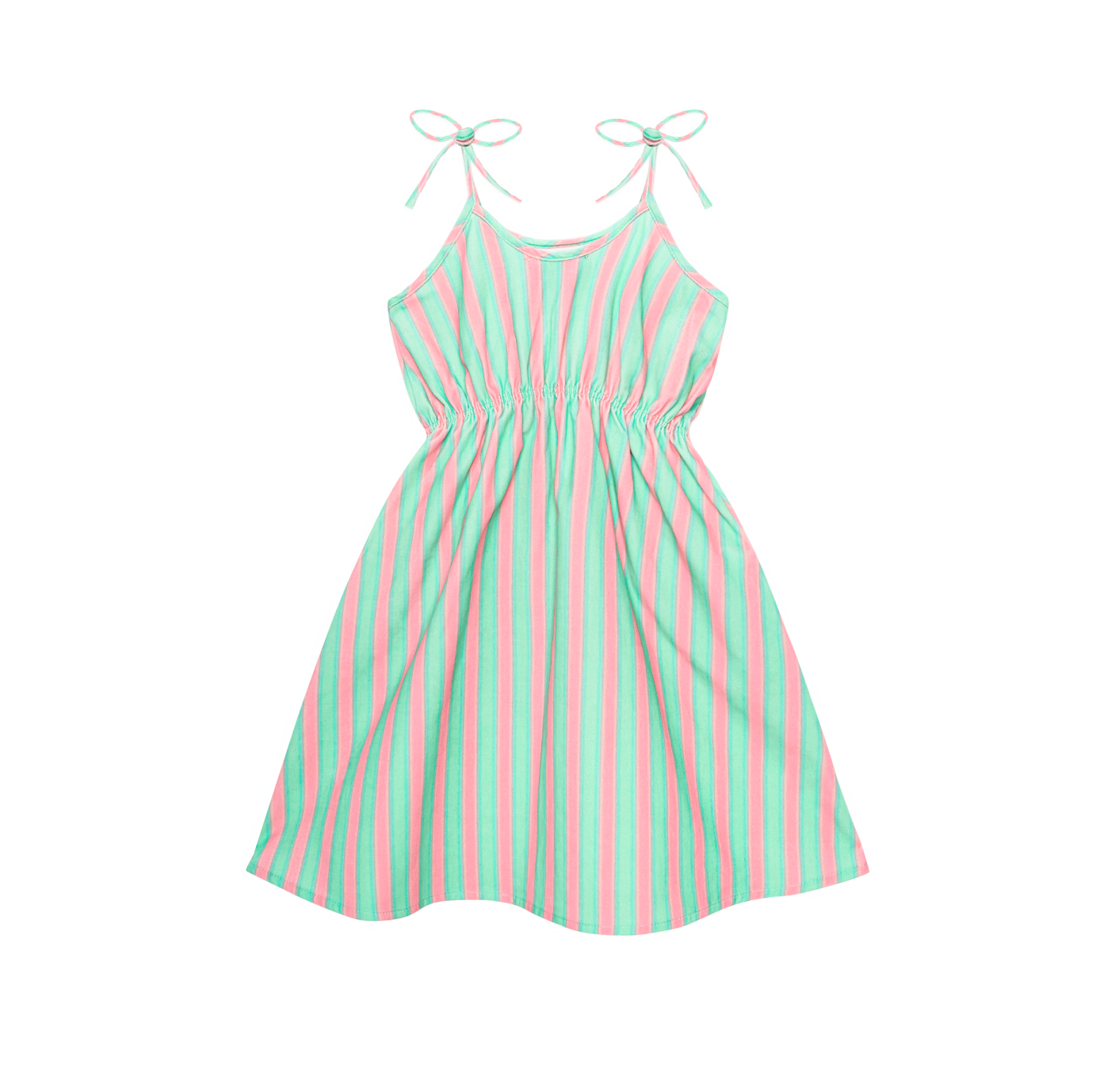 This beautiful and soft striped dress is perfect for every day and any day! Features a contrasting stripe pattern in green and pink, a cinched elasticated waist and tied shoulder straps. Rock solo for a sweet look or wear over their favorite tee and tank top.