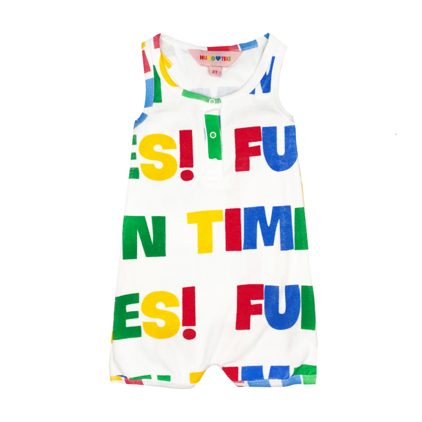 The most adorable terry short romper featuring an all over rainbow colored fun print on a white terry base. Pair with our matching pieces for the sweetest look!
