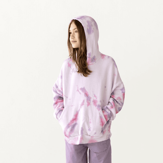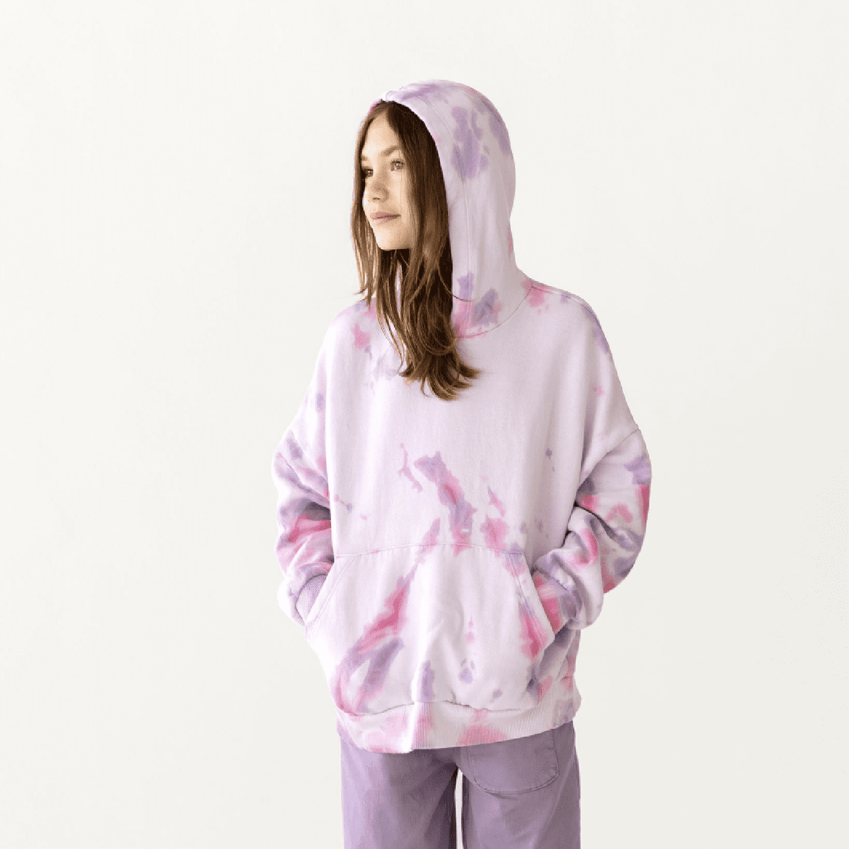 A cool and relaxed fit hooded sweatshirt featuring a unique all over tie dye design and a kangaroo pocket. Designed for boys and girls alike!