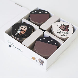 You will find owl, squirrel, hedgehog, fox, and more in this illustrated Woodland themed set. The cards are made of sturdy FSC certified board, and the box has a magnet closure for easy storage.