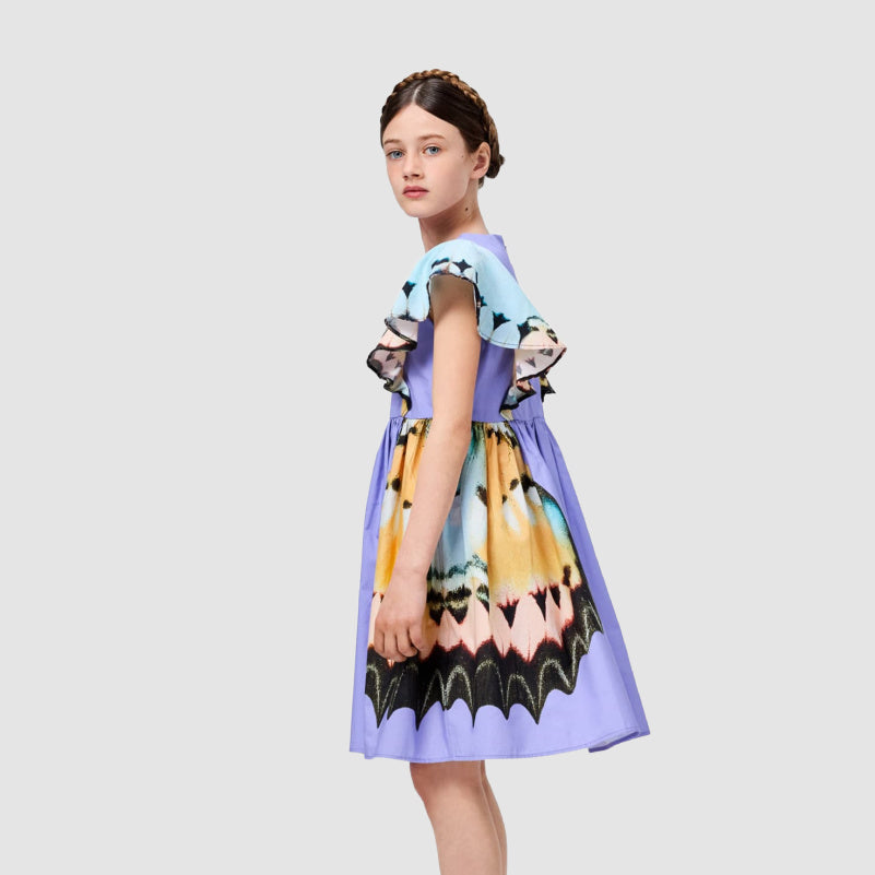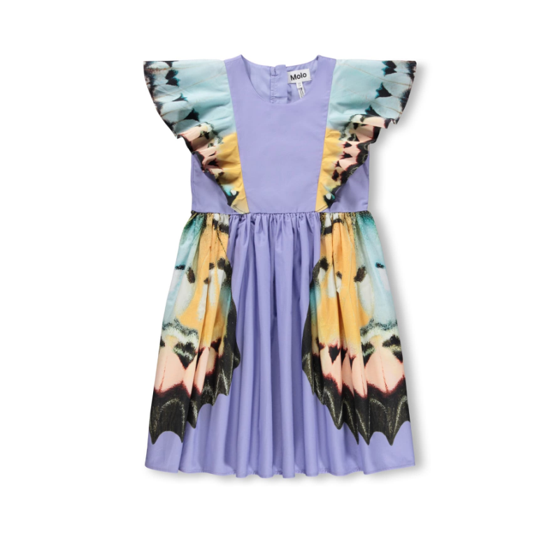 An absolutely gorgeous woven, lilac dress with a butterfly print, ruffled shoulder, and pleated base. A must for every occasion.