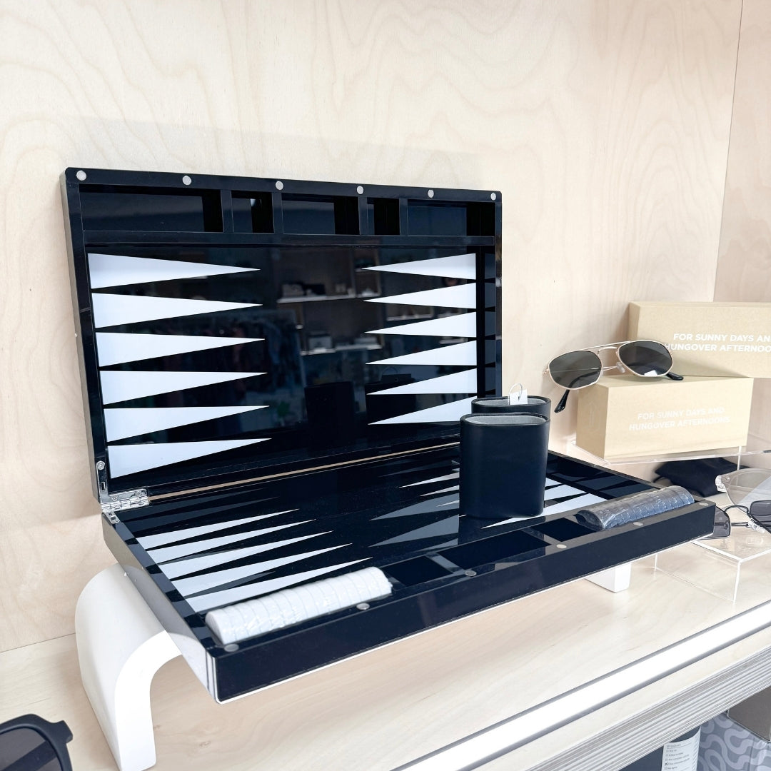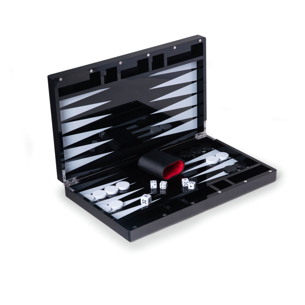 This lucite backgammon set brings a modern twist to a classic game of backgammon. It's magnetic closure and discreet hinges provide for a sleek and minimal design, perfect for any living room, game room, office or man cave - a sure conversation starter! Set includes black and white playing pieces, two sets of dice, two dice cups and a doubling dice.