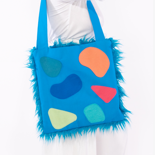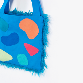 Handmade from soft, hand dyed, cotton denim. Featuring a unique graphic applique on the front, soft faux fur back, and lined with soft denim. Perfectly size for a day bag and running errands with this colorful tote will certainly turn some heads.