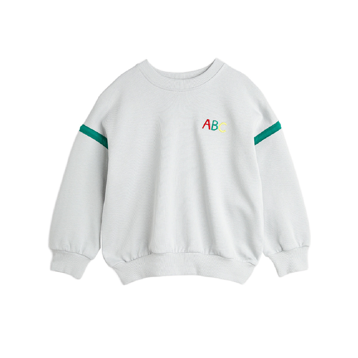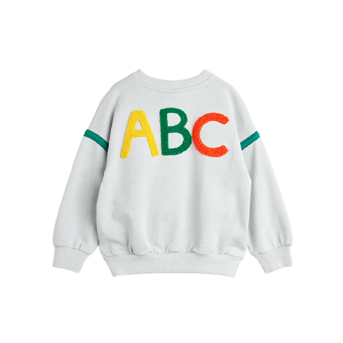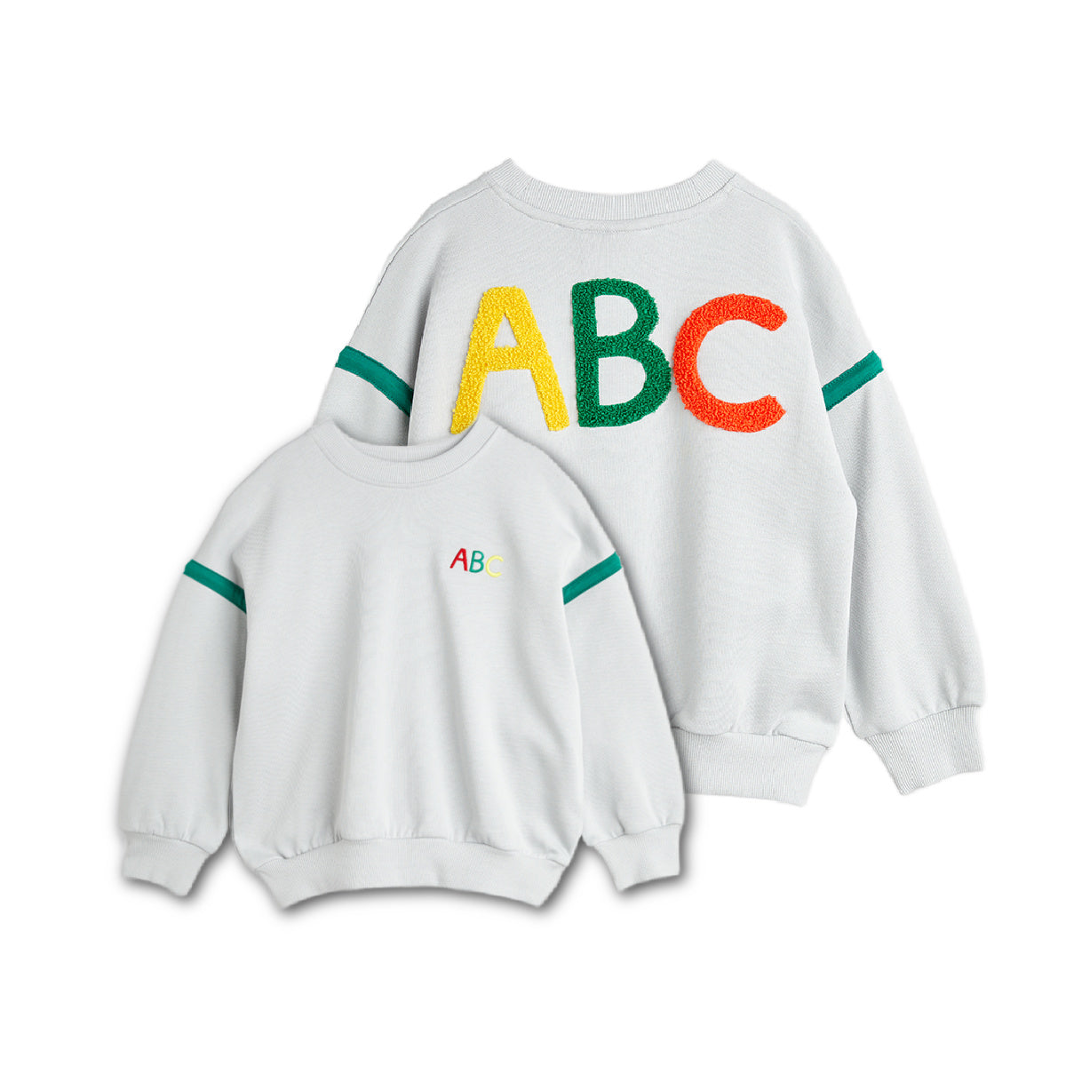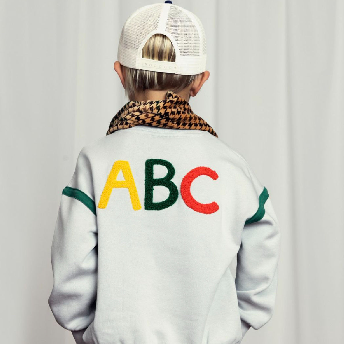 A cool and cozy relaxed fit sweatshirt featuring a textured ABC design on the back, embroidery on the front, and stripes on the sleeves for your school loving kid.