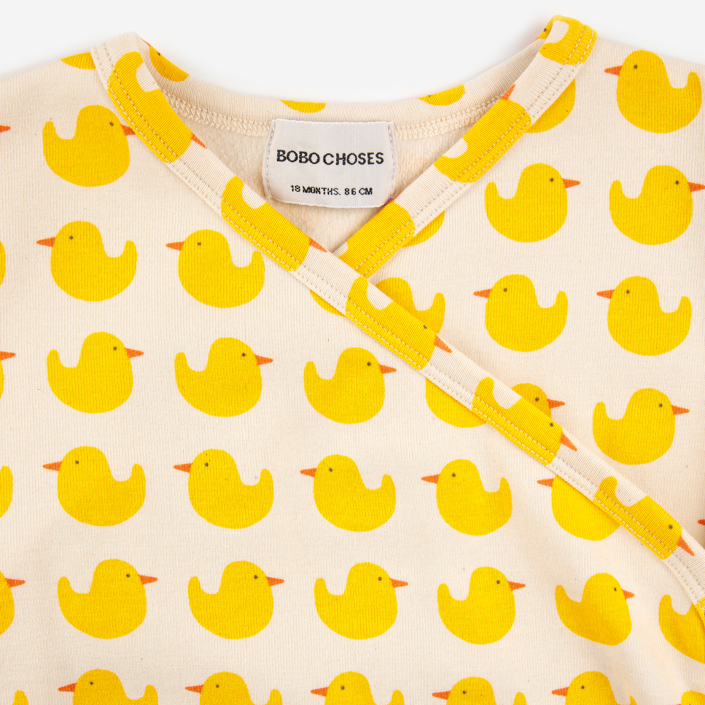 A beautiful long sleeve onesie featuring an all over rubber duck print on an off white base on the front for babies and toddlers.