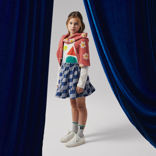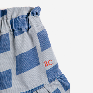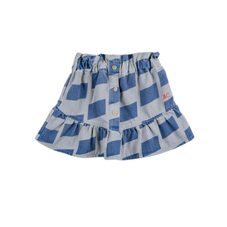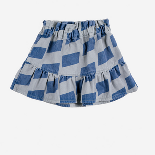 A really unique and super cool denim skirt featuring an all over checkered print, button front, ruffled bottom, and adjustable waistband.