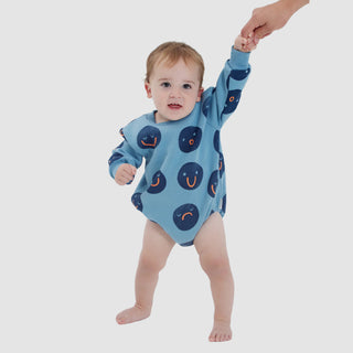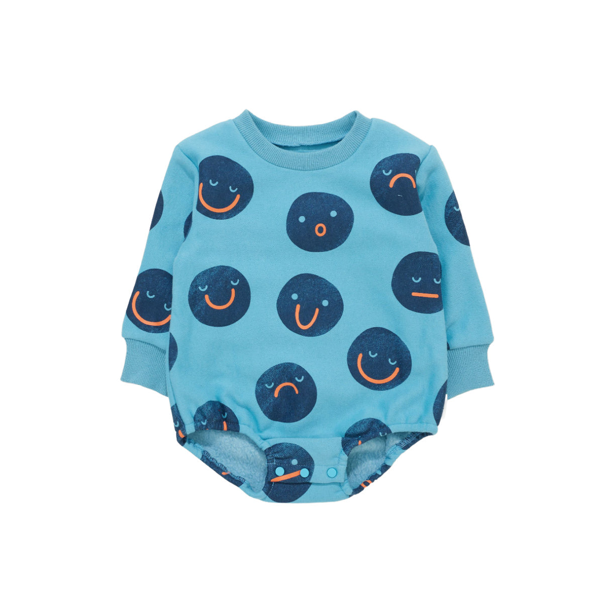 An adorable and easy to pop on style with a relaxed fit featuring a button leg opening and stretchy ribbed cuffs around the hands and neck for comfort. A true sweater fleece fabric in teal with this seasons moods face print all over.