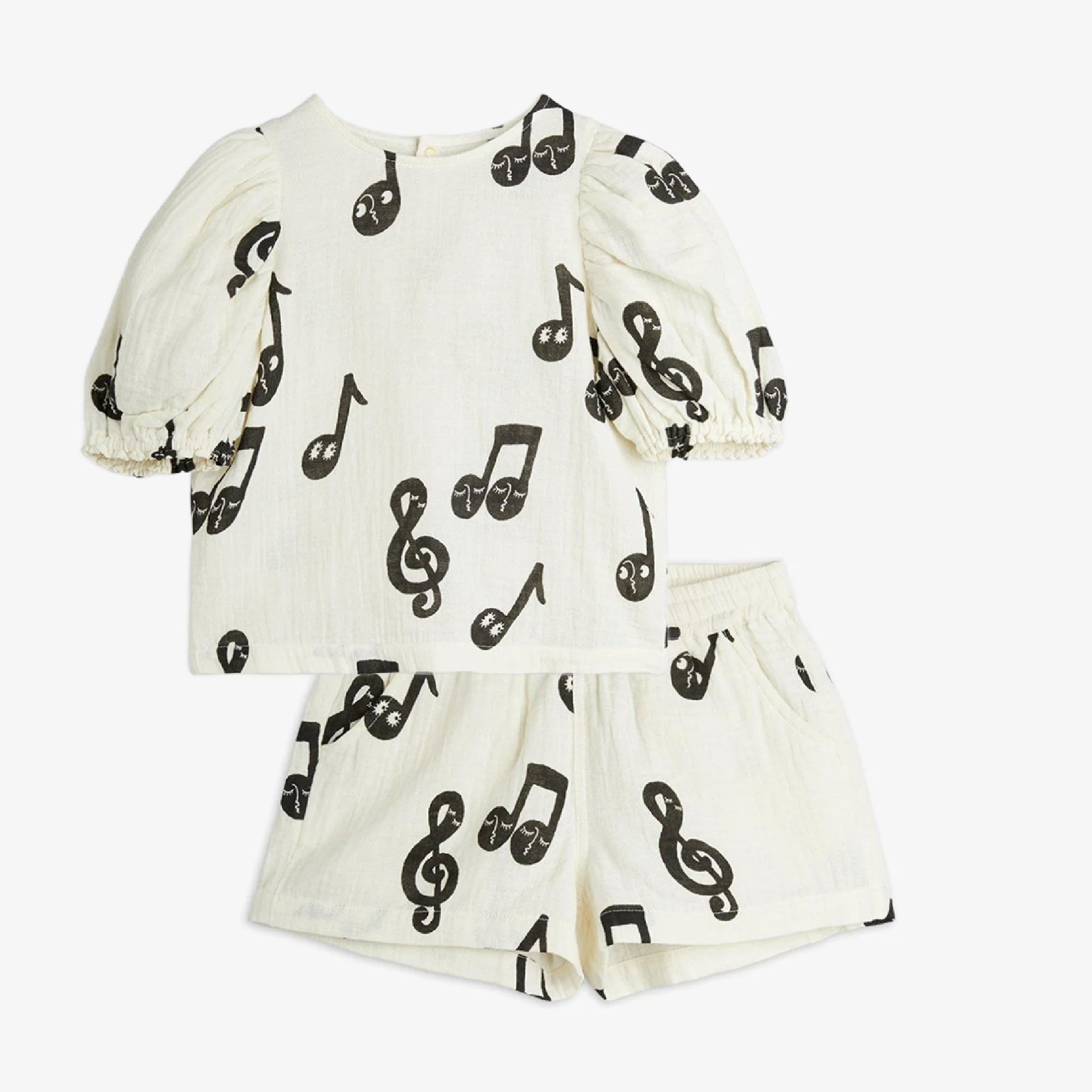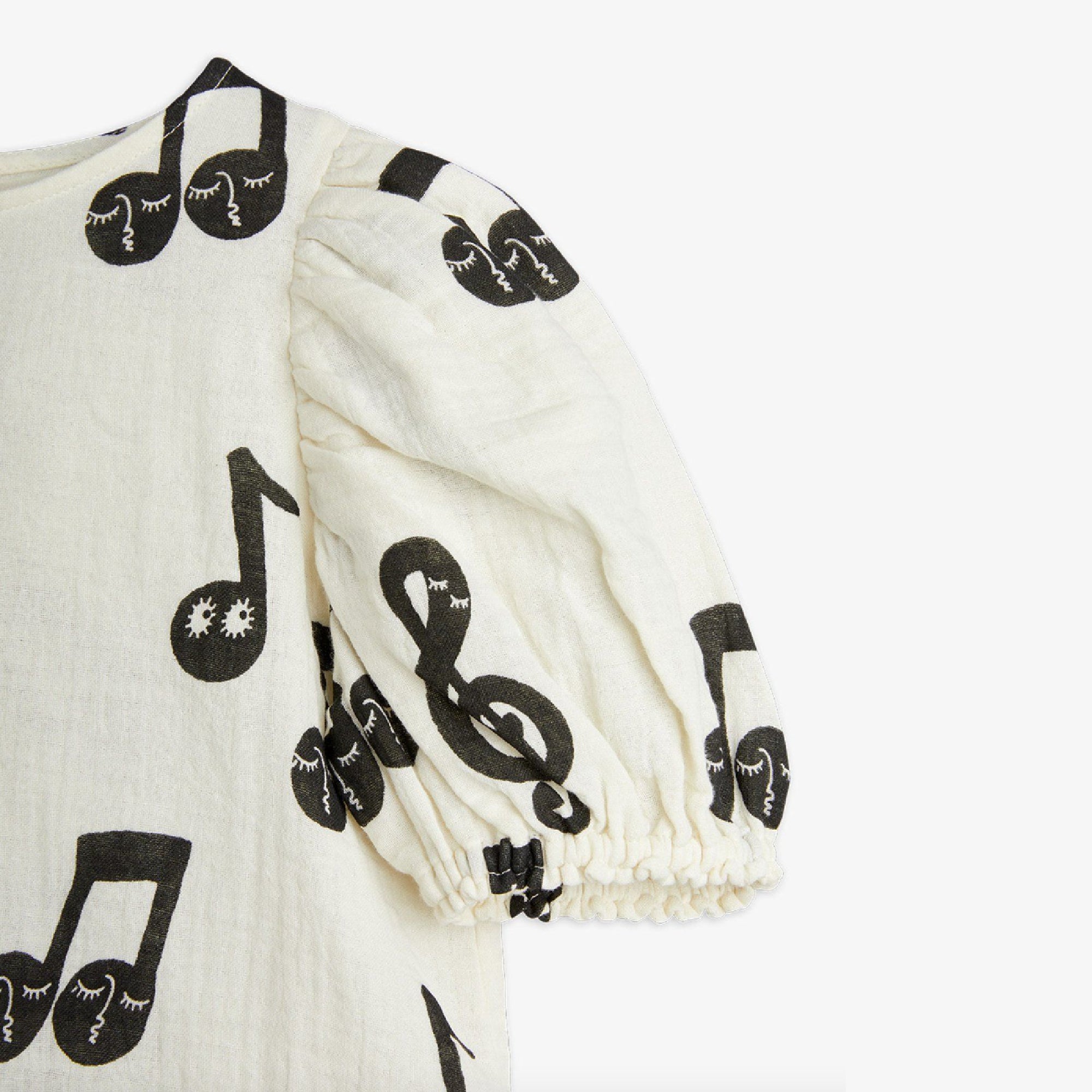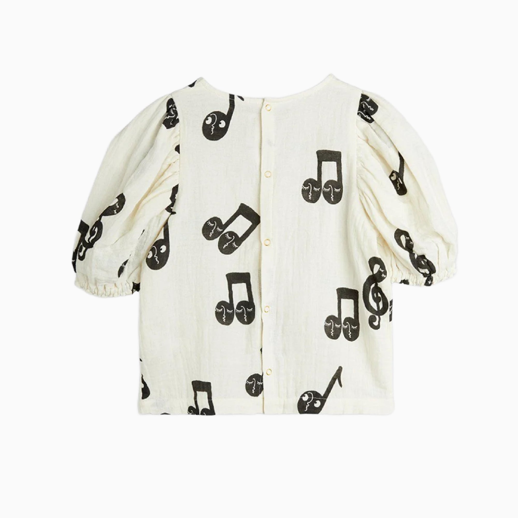 A playful and beautiful muslin shirt with an all over musical note print, designed with puff sleeves and snap buttons in the back for easy dressing.