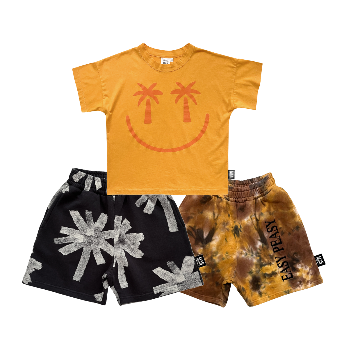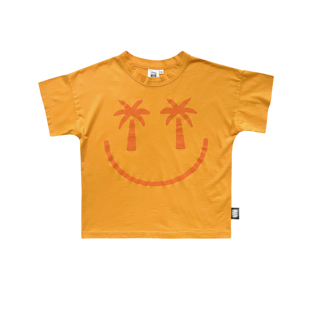 A soft, loose and boxy fitting short sleeve tee shirt featuring a palm tree smiley face print on the front. Designed for boys and girls.