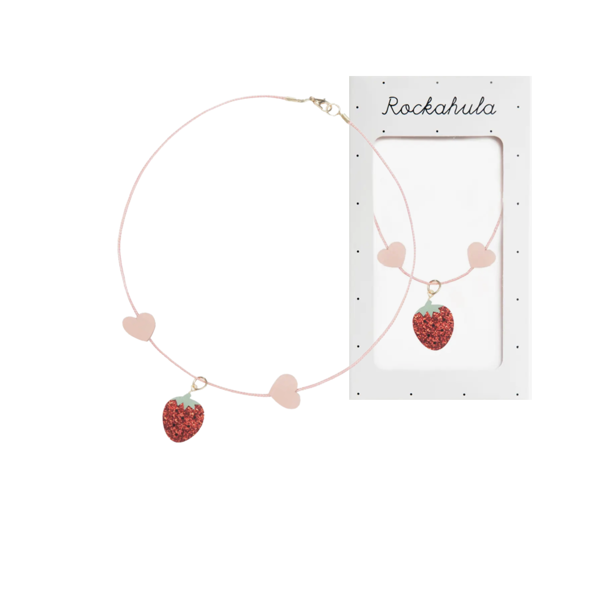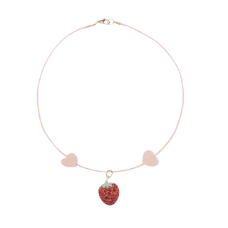 The sweetest little strawberry adorns this necklace with cute little PU hearts - perfect for a summer picnic! Set on a pale pink cord necklace with a lobster clasp fastening and extender chain to ensure the perfect fit.