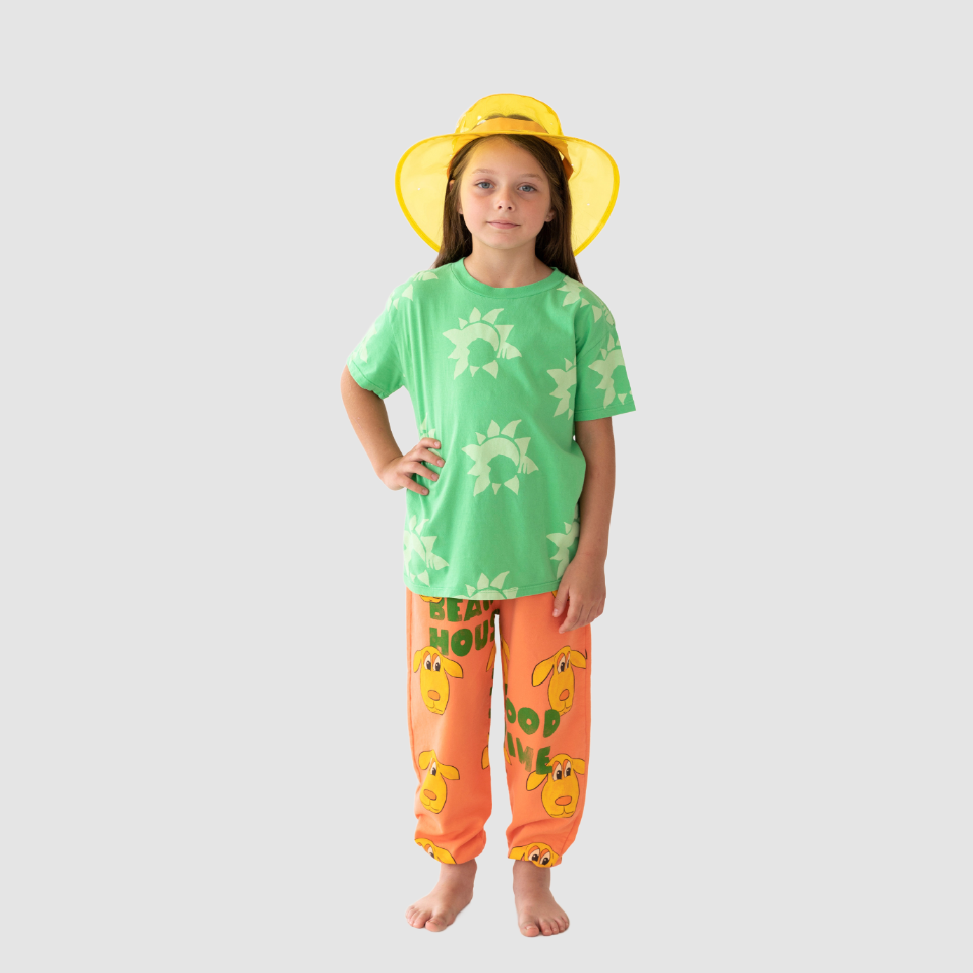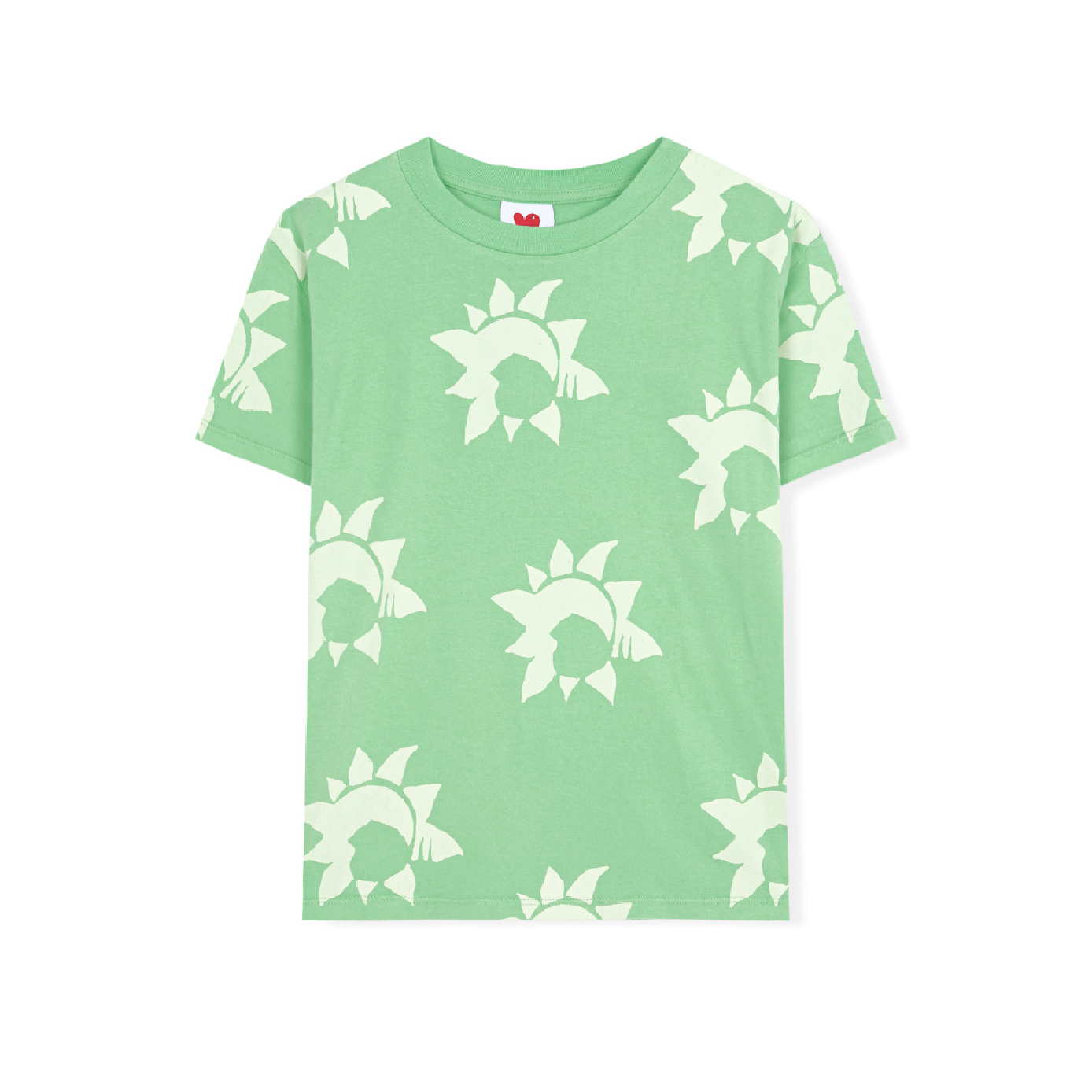 A relaxed fit tee shirt with an all over sun print on a green base and a round neckline. Model in photo is wearing a size 8 years (4'1" tall).
